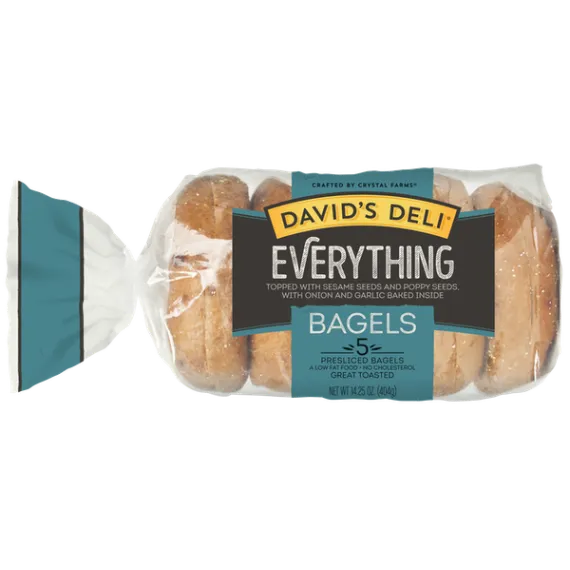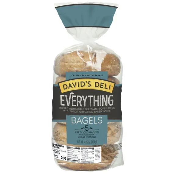 Details Ingredients ENRICHED HIGH GLUTEN FLOUR (WHEAT FLOUR, MALTED BARLEY, NIACIN, REDUCED IRON, THIAMINE MONONITRATE, RIBOFLAVIN, FOLIC ACID), WATER, ONION, YEAST, CALCIUM PROPIONATE (PRESERVATIVE), SALT, SUGAR, MONO-DIGLYCERIDES, VINEGAR, GARLIC, MALT, ENZYME, CORNMEAL. TOPPED WITH SESAME SEEDS AND POPPY SEEDS. Show more Product features Enjoy the delicious taste of David's Deli Bagels. They're topped with sesame and poppy seeds, as well as onion and garlic for added flavor. David's Everything Bagels are made from enriched wheat flour and malted barley. They're easy to prepare by just slicing and cooking in a toaster, in the oven or on a grill. These bagels make a tasty treat for breakfast, lunch or as a snack throughout the day. They're low in fat and free of cholesterol. David's Deli Everything Bagels, 5-Count, 14.25 oz: Topped with sesame seeds, poppy seeds, onion and garlic Made with enriched wheat flour and malted barley A low fat food with no cholesterol Easy to prepare in a toaster, in the oven or on a grill Ideal for breakfast, lunch or as a tasty snack 14.25 oz pack of David's bagels in a 5-count Net Quantity of Content 5 X 81 g