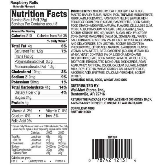 Details Ingredients ENRICHED WHEAT FLOUR (WHEAT FLOUR, MALTED BARLEY FLOUR, NIACIN, IRON, THIAMINE MONONITRATE, RIBOFLAVIN, FOLIC ACID), RASPBERRY FILLING (WATER, HIGH FRUCTOSE CORN SYRUP, SUGAR, RASPBERRIES, CORN SYRUP, FOOD STARCH-MODIFIED, NATURAL FLAVORS, CELLULOSE GUM, CITRIC ACID, POTASSIUM SORBATE [PRESERVATIVE], SALT, SODIUM CITRATE, RED 40), WATER, SUGAR, HIGH FRUCTOSE CORN SYRUP, MARGARINE (PALM OIL, SOYBEAN OIL, WATER, SALT, CONTAINS LESS THAN 2% OF EACH OF MONO- AND DIGLYCERIDES, SOY LECITHIN, SODIUM BENZOATE [A PRESERVATIVE], CITRIC ACID, NATURAL & ARTIFICIAL FLAVOR, VITAMIN A PALMITATE, BETA-CAROTENE [COLOR], VITAMIN D3, WHEY), YEAST, CONTAINS 2% OR LESS OF: MONO- AND DIGLYCERIDES, SALT, CORN SYRUP, PALM OIL, WHOLE EGGS, DEXTROSE, ETHOXYLATED MONO-AND DIGLYCERIDES, AGAR AGAR, WHEY, ARTIFICIAL COLOR, CALCIUM SULFATE, NONFAT MILK, SOY LECITHIN, WHEAT STARCH, CALCIUM PEROXIDE, ASCORBIC ACID, ENZYMES, CALCIUM HYDROXIDE, SODIUM CITRATE. Show more Product features Freshness Guaranteed Raspberry Rolls are a great and easy way to satisfy your sweet tooth. These pastries provide a light yet delectable taste that, when paired with a hot cup of coffee or cold milk, amplifies to the overall personality of your meal’s flavor. With its soft, sugary bread and delightful raspberry icing, each of the eight rolls deliver the mouth-watering, fruit flavor you were looking for. Pack a roll away in your lunch bag for a dessert at work, refrigerate one to enjoy as a cold snack to follow a hot meal, or enjoy as a quick breakfast treat on your way out the door in the morning. Fulfill your need for sweets and bring home a package of the Freshness Guaranteed Raspberry Rolls. Freshness Guaranteed provides you and your family with high-quality fresh food that saves you time and money, many of which are cooked fresh or prepared in stores. Convenient solutions with value added in every Spark Fresh item. Freshness Guaranteed Raspberry Rolls, 22 oz, 8 Count: Delicious sugary rolls with raspberry icing Reclosable packaging helps maintain freshness between snacking Share with friends or coworkers, or enjoy them on your own Pairs great with coffee for a simple morning meal Net Quantity of Content 8 X 78 g