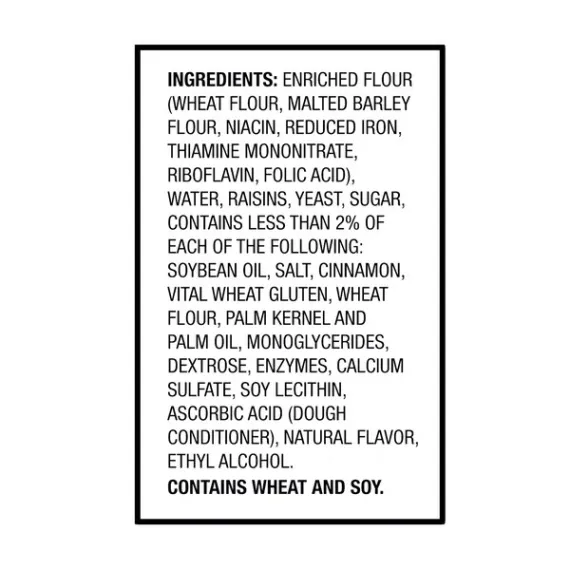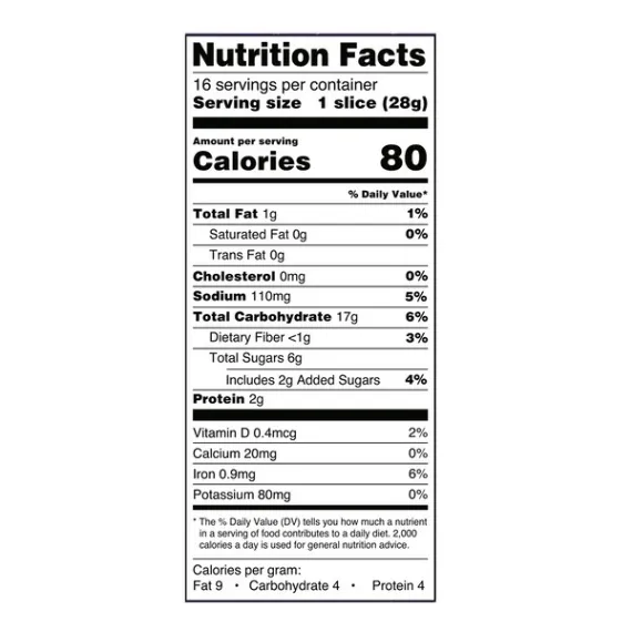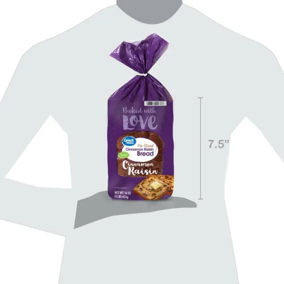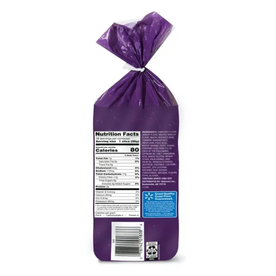 Details Ingredients ENRICHED FLOUR (WHEAT FLOUR, MALTED BARLEY FLOUR, NIACIN, REDUCED IRON, THIAMINE MONONITRATE, RIBOFLAVIN, FOLIC ACID), WATER, RAISINS, YEAST, SUGAR, CONTAINS LESS THAN 2% OF EACH OF THE FOLLOWING: SOYBEAN OIL, SALT, CINNAMON, VITAL WHEAT GLUTEN, WHEAT FLOUR, PALM KERNEL AND PALM OIL, MONOGLYCERIDES, DEXTROSE, ENZYMES, CALCIUM SULFATE, SOY LECITHIN, ASCORBIC ACID (DOUGH CONDITIONER), NATURAL FLAVOR, ETHYL ALCOHOL. Show more Product features Start your day with a sweet touch of cinnamon and juicy raisins in every bite of Great Value Cinnamon Raisin Bread. Perfect for a filling breakfast or a quick snack, Great Value Cinnamon Raisin Bread has a soft texture you'll love, with a delicious taste you can't resist. Toast some and top with butter or a schmear of cream cheese, spread on some peanut or almond butter and add a sprinkle of granola, or use as the base for a sweet and savory breakfast sandwich with an egg and bacon. No matter how you top your Great Value Cinnamon Raisin Bread, it's sure to be a delicious part of your day! Great Value products provide families with affordable, high-quality grocery and household consumable options. With our wide range of product categories spanning grocery and household consumables, we offer you a variety of products for your family's needs. Our products are conveniently available online and in Walmart stores nationwide, allowing you to stock up and save money at the same time. Great Value Cinnamon Raisin Bread, 16oz: Delicious pre-sliced cinnamon raisin bread Ideal for a small meal or snack Only 80 calories per slice Great toasted and topped with your favorite schmear Net Quantity of Content 16 X 28 g