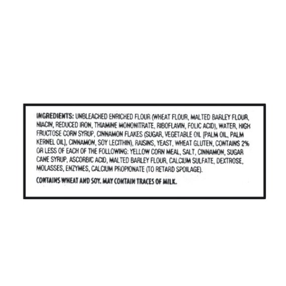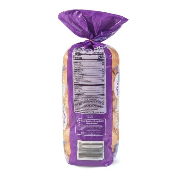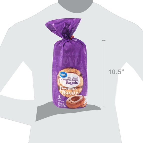 Details Ingredients Enriched Flour (Wheat Flour, Malted Barley Flour, Niacin, Reduced Iron, Thiamine Mononitrate, Riboflavin, Folic Acid), Water, High Fructose Corn Syrup, Cinnamon Flakes (Sugar, Vegetable Oil [Palm Oil, Palm Kernel Oil], Cinnamon, Soy Lecithin), Raisins, Contains 2% Or Less of Each of The Following: Yeast, Wheat Gluten, Yellow Corn Meal, Salt, Cinnamon, Caramel Color, Sugar Cane Syrup, Malted Barley Flour, Calcium Sulfate, Dextrose, Molasses, Ascorbic Acid, Enzymes, Calcium Propionate (to Retard Spoilage). Allergy Warning: Contains Wheat And Soy. May Contain Traces of Milk. Show more Product features Great Value Pre-Sliced Cinnamon Raisin Bagels are baked to perfection and packed with sweet goodness that will have your taste buds coming back for more. Enjoy them toasted and spread with cream cheese, or serve with scrambled eggs and crispy bacon strips. These bagels are perfect for breakfast, but you could savor them any time of the day. These bagels also offer nutritional benefits as they are a good source of protein, calcium and iron. Enjoy the authentic and gourmet flavors of Great Value Pre-Sliced Cinnamon Raisin Bagels. Great Value products provide families with affordable, high quality grocery and household consumable options. With our wide range of product categories spanning grocery and household consumables, we offer you a variety of products for your family's needs. Our products are conveniently available online and in Walmart stores nationwide, allowing you to stock up and save money at the same time. Great Value Pre-Sliced Cinnamon Raisin Bagels, 18 oz, 6 Count: 6 pre-sliced cinnamon raisin bagels Enjoy toasted and spread with cream cheese Great for breakfast or a quick snack 8 grams of protein per bagel Good source of iron and calcium Net Quantity of Content 6 X 85 G