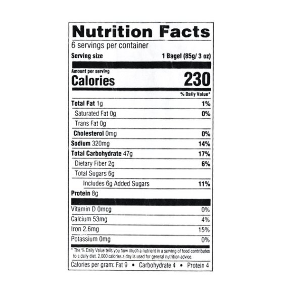 Details Ingredients ENRICHED FLOUR (WHEAT FLOUR, MALTED BARLEY FLOUR, NIACIN, REDUCED IRON, THIAMINE MONONITRATE, RIBOFLAVIN, FOLIC ACID), WATER, HIGH FRUCTOSE CORN SYRUP, YELLOW CORN MEAL, CONTAINS 2% OR LESS OF EACH OF THE FOLLOWING: WHEAT GLUTEN, SALT, YEAST, SUGAR CANE SYRUP, MALTED BARLEY FLOUR, CALCIUM SULFATE, DEXTROSE, MOLASSES, ENZYMES, ASCORBIC ACID, CALCIUM PROPIONATE (TO RETARD SPOILAGE). Show more Product features Great Value Pre-Sliced Plain Bagels are baked to perfection and packed with delicious flavor that will have your taste buds coming back for more. Enjoy them toasted and spread with cream cheese, or serve with scrambled eggs and crispy bacon strips. These bagels are perfect for breakfast, but you could savor them any time of the day. These bagels also offer nutritional benefits as they are a good source of protein, calcium and iron. Enjoy the authentic and gourmet flavors of Great Value Pre-Sliced Plain Bagels. Great Value products provide families with affordable, high quality grocery and household consumable options. With our wide range of product categories spanning grocery and household consumables, we offer you a variety of products for your family's needs. Our products are conveniently available online and in Walmart stores nationwide, allowing you to stock up and save money at the same time. Great Value Pre-Sliced Plain Bagels, 18 oz, 6 Count: 6 pre-sliced plain bagels Enjoy toasted and spread with cream cheese Great for breakfast or a quick snack 8 grams of protein per bagel Good source of iron and calcium Net Quantity of Content 6 X 85 g