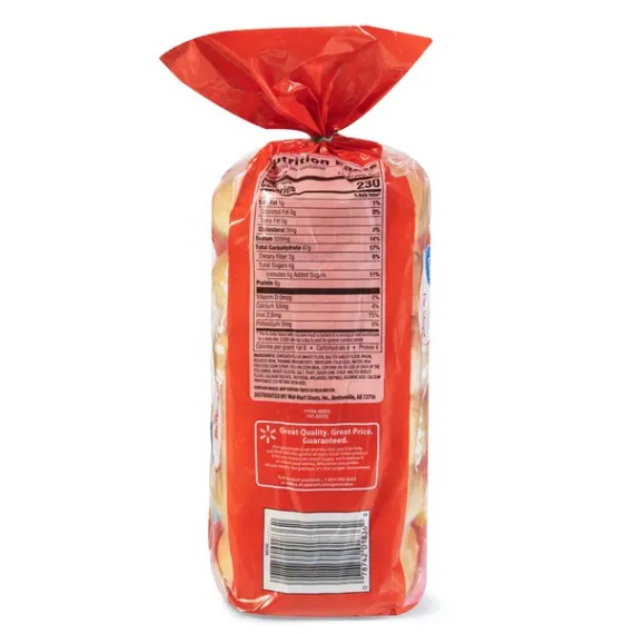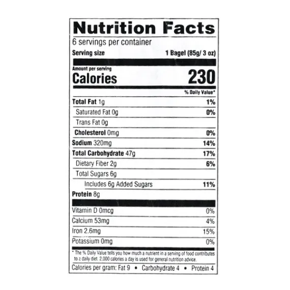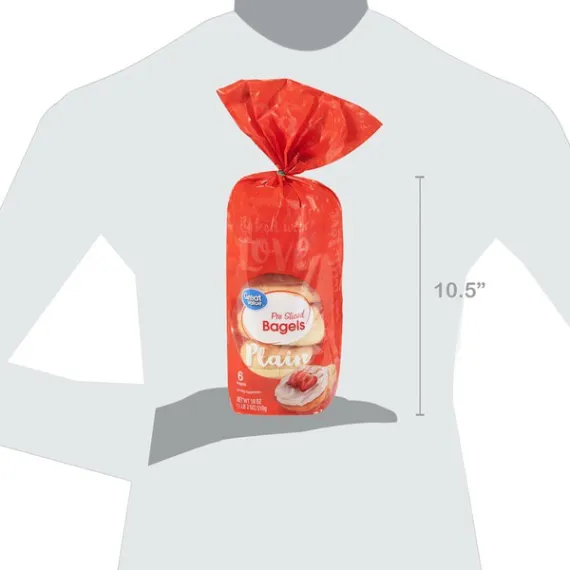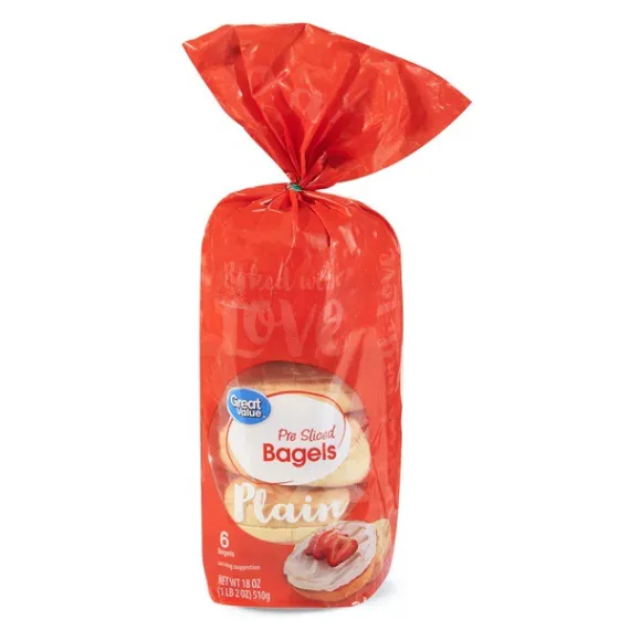 Details Ingredients ENRICHED FLOUR (WHEAT FLOUR, MALTED BARLEY FLOUR, NIACIN, REDUCED IRON, THIAMINE MONONITRATE, RIBOFLAVIN, FOLIC ACID), WATER, HIGH FRUCTOSE CORN SYRUP, YELLOW CORN MEAL, CONTAINS 2% OR LESS OF EACH OF THE FOLLOWING: WHEAT GLUTEN, SALT, YEAST, SUGAR CANE SYRUP, MALTED BARLEY FLOUR, CALCIUM SULFATE, DEXTROSE, MOLASSES, ENZYMES, ASCORBIC ACID, CALCIUM PROPIONATE (TO RETARD SPOILAGE). Show more Product features Great Value Pre-Sliced Plain Bagels are baked to perfection and packed with delicious flavor that will have your taste buds coming back for more. Enjoy them toasted and spread with cream cheese, or serve with scrambled eggs and crispy bacon strips. These bagels are perfect for breakfast, but you could savor them any time of the day. These bagels also offer nutritional benefits as they are a good source of protein, calcium and iron. Enjoy the authentic and gourmet flavors of Great Value Pre-Sliced Plain Bagels. Great Value products provide families with affordable, high quality grocery and household consumable options. With our wide range of product categories spanning grocery and household consumables, we offer you a variety of products for your family's needs. Our products are conveniently available online and in Walmart stores nationwide, allowing you to stock up and save money at the same time. Great Value Pre-Sliced Plain Bagels, 18 oz, 6 Count: 6 pre-sliced plain bagels Enjoy toasted and spread with cream cheese Great for breakfast or a quick snack 8 grams of protein per bagel Good source of iron and calcium Net Quantity of Content 6 X 85 g