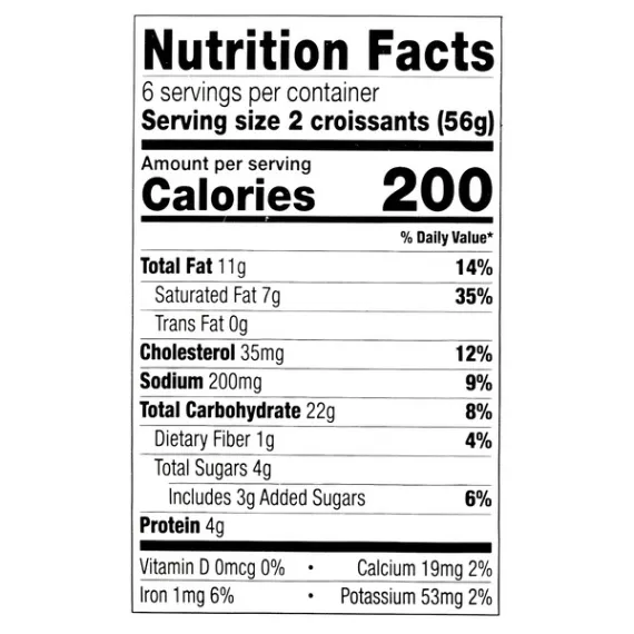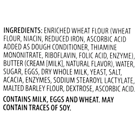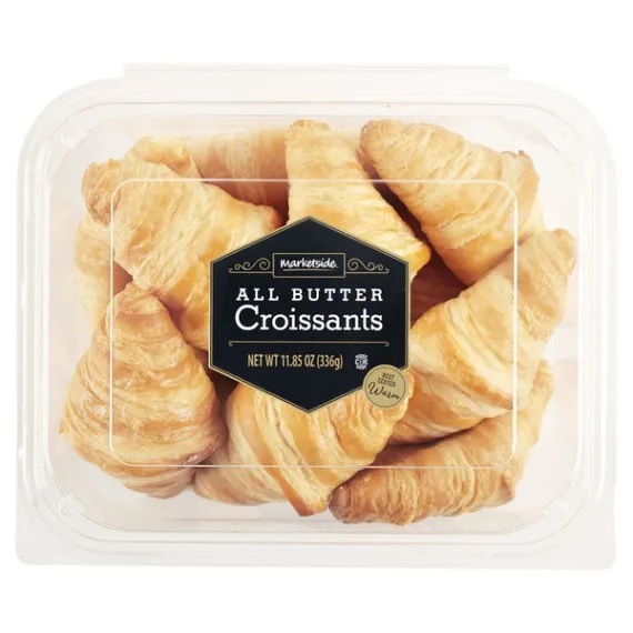 Details Ingredients Enriched bleached wheat flour (wheat flour, niacin, reduced iron, ascorbic acid added as dough conditioner, thiamine mononitrate, riboflavin, folic acid, enzyme), butter (cream [milk], natural flavor), water, sugar, eggs, dry whole milk, yeast, salt, acacia, enzymes, sodium stearoyl lactylate, malted barley flour, dextrose, ascorbic acid Show more Product features Enjoy the fresh baked taste of Marketside All Butter Croissants. This traditional French pastry features a delicious flaky outside with a soft, layered puff pastry buttery center. These buttery croissants are best served warm. The croissants are delightful to enjoy as a tasty breakfast or a snack throughout the day. For an extra special breakfast add some scrambled eggs and crispy breakfast for a satisfying breakfast sandwich. They come in a reclosable container for convenience and to help maintain freshness in-between snacking. The container comes with 12 croissants so there is plenty to share. Treat yourself to the light buttery taste of a Marketside All Butter Croissants. Fresh ideas and quality ingredients, that's how Marketside brings the best foods to your table. We are committed to deliver freshness that you can taste and see. Marketside offers the best in fresh food, guaranteed by Walmart, working in partnership with farmers, bakers and chefs for the highest quality, authentic ingredients and favorite recipes. Marketside All Butter Croissant, 11.85 oz, 12 Count: Fluffy, buttery croissants best served warm Reclosable container to help maintain freshness Great for breakfast or as a snack throughout the day Net Quantity of Content 6 X 2 croissants (56g)