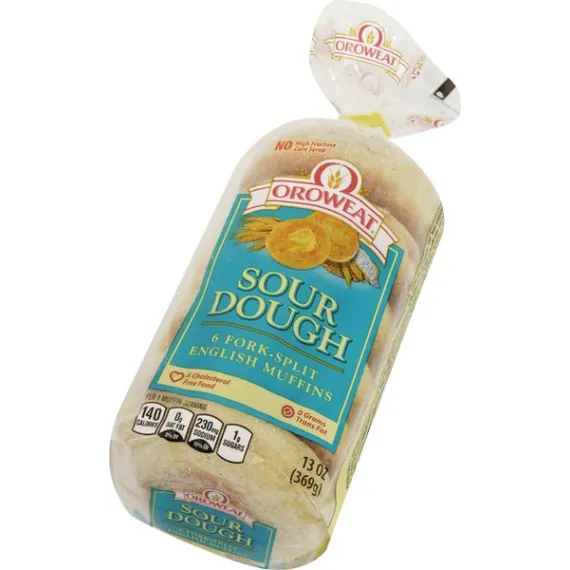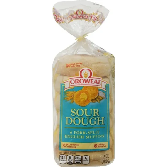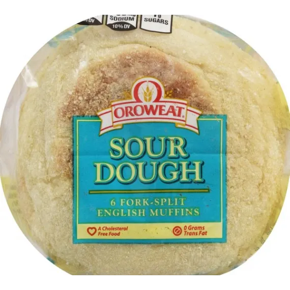 Details Ingredients UNBLEACHED ENRICHED FLOUR [WHEAT FLOUR, MALTED BARLEY FLOUR, NIACIN, REDUCED IRON, THIAMIN MONONITRATE (VITAMIN B1), RIBOFLAVIN (VITAMIN B2), FOLIC ACID], WATER, RICE FLOUR, YEAST, CORN MEAL, SALT, SUGAR, SOYBEAN OIL, WHEAT STARCH, WHEAT GLUTEN, CALCIUM PROPIONATE (PRESERVATIVE), POTASSIUM SORBATE (PRESERVATIVE), MONOGLYCERIDES, ACETIC ACID, CITRIC ACID, SOY FLOUR. Show more Product features Oroweat Sourdough English Muffins are soft, tangy, and delicious when toasted. Top with butter or your favorite spread, and savor that old world sourdough flavor. 0g Trans Fat Low Fat No High Fructose Corn Syrup 6 in a pack Special Features No trans fat Net Quantity of Content 6 X 62 g