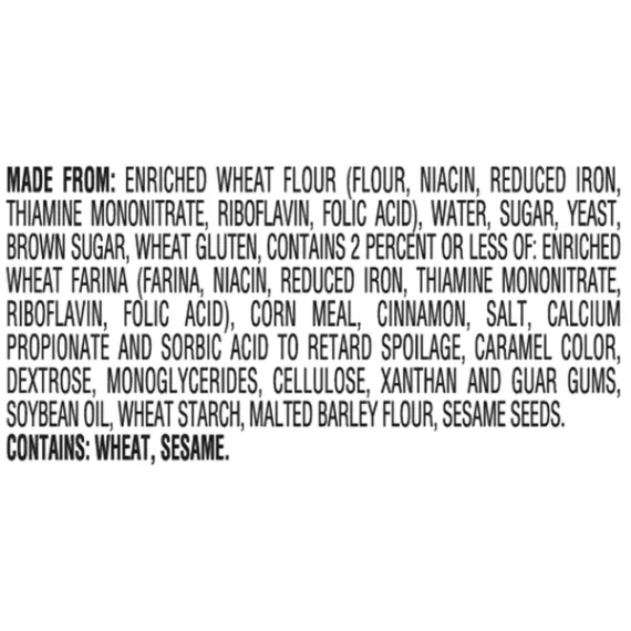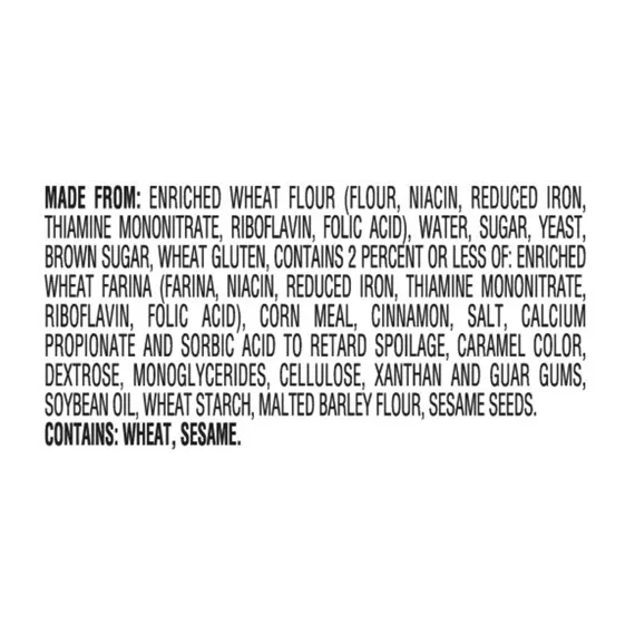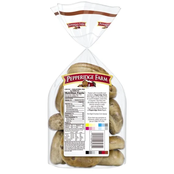 Details Ingredients Made From: Enriched Wheat Flour (Flour, Niacin, Reduced Iron, Thiamine Mononitrate, Riboflavin, Folic Acid), Water, Sugar, Yeast, Brown Sugar, Wheat Gluten, Contains 2 Percent Or Less Of: Enriched Wheat Farina (Farina, Niacin, Reduced Iron, Thiamine Mononitrate, Riboflavin, Folic Acid), Corn Meal, Cinnamon, Salt, Calcium Propionate And Sorbic Acid To Retard Spoilage, Caramel Color, Dextrose, Monoglycerides, Cellulose, Xanthan And Guar Gums, Soybean Oil, Wheat Starch, Malted Barley Flour, Sesame Seeds. Contains: Wheat, Sesame. Show more Product features Carefully prepared by our expert bakers, Pepperidge Farm Mini Bagels are just the right blend of wholesome and delicious. The secret is in the way they're made. We use only the finest quality ingredients and then we boil and bake them to perfection, so they're soft and chewy on the inside, with a golden crust on the outside. Pre-sliced for your convenience, you can enjoy them toasted or right out of the bag; top them with your favorite spread, or add a tasty filling for the perfect sandwich. Pepperidge Farm Mini Bagels are perfect any time of the day! Mini Brown Sugar Cinnamon Bagel Low Fat Cholesterol Free 0g trans fat per serving 17 oz., 12 count pre-sliced bag Special Features Cholesterol free Net Quantity of Content 12.0 X 1 Bagel (40g/1.4 oz)
