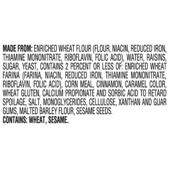 Details Ingredients Made From: Enriched Wheat Flour (Flour, Niacin, Reduced Iron, Thiamine Mononitrate, Riboflavin, Folic Acid), Water, Raisins, Sugar, Yeast, Contains 2 Percent Or Less Of: Enriched Wheat Farina (Farina, Niacin, Reduced Iron, Thiamine Mononitrate, Riboflavin, Folic Acid), Corn Meal, Cinnamon, Caramel Color, Wheat Gluten, Calcium Propionate And Sorbic Acid To Retard Spoilage, Salt, Monoglycerides, Cellulose, Xanthan And Guar Gums, Malted Barley Flour, Sesame Seeds. Contains: Wheat, Sesame. Show more Product features Carefully prepared by our expert bakers, Pepperidge Farm Mini Bagels are just the right blend of wholesome and delicious. The secret is in the way they're made. We use only the finest quality ingredients and then we boil and bake them to perfection, so they're soft and chewy on the inside, with a golden crust on the outside. Pre-sliced for your convenience, you can enjoy them toasted or right out of the bag; top them with your favorite spread, or add a tasty filling for the perfect sandwich. Pepperidge Farm Mini Bagels are perfect any time of the day! Mini Cinnamon Raisin Bagel Low Fat Cholesterol Free 0g trans fat per serving 17 oz., 12 count pre-sliced bag Net Quantity of Content 12.0 X 1 Bagel (40g/1.4 oz)