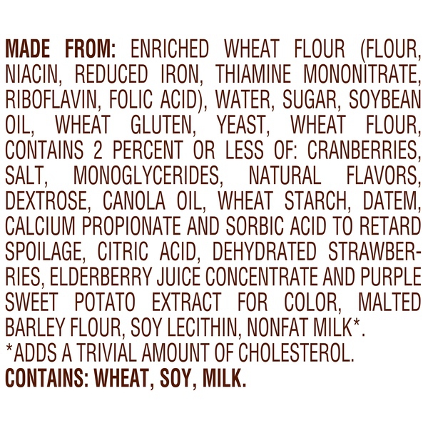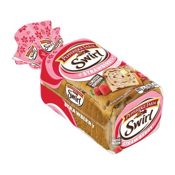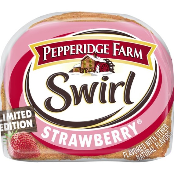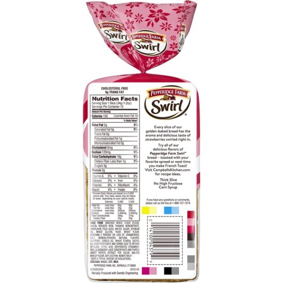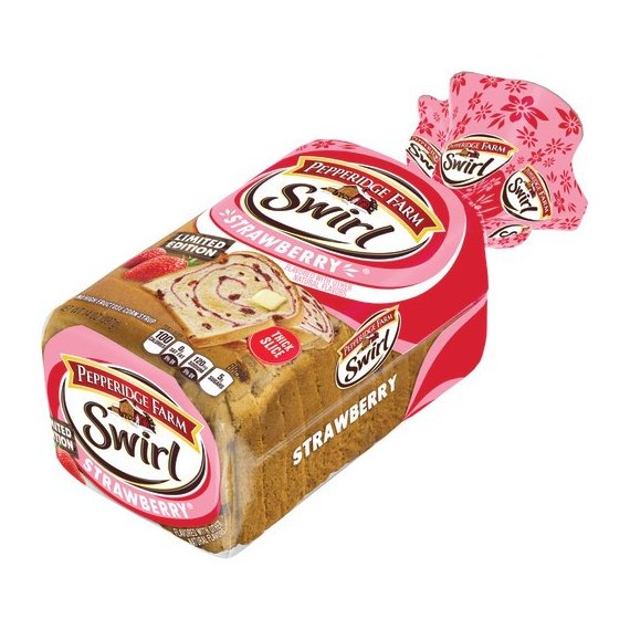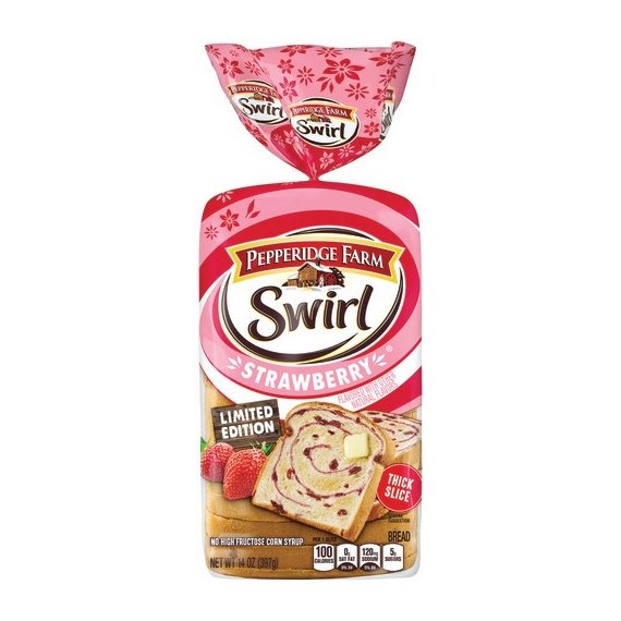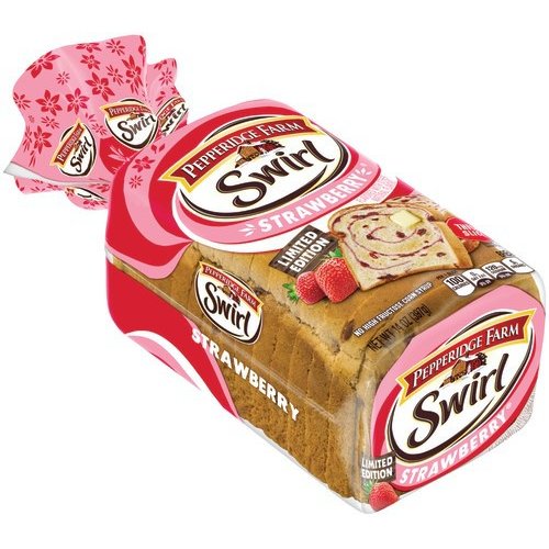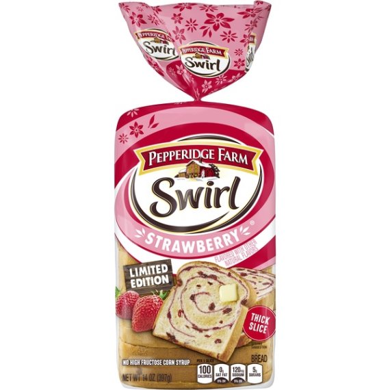 Details Ingredients Made From: Enriched Wheat Flour (Flour, Niacin, Reduced Iron, Thiamine Mononitrate, Riboflavin, Folic Acid), Water, Sugar, Soybean Oil, Wheat Gluten, Yeast, Wheat Flour, Contains 2 Percent Or Less Of: Cranberries, Salt, Monoglycerides, Natural Flavors, Dextrose, Canola Oil, Wheat Starch, Datem, Calcium Propionate And Sorbic Acid To Retard Spoilage, Citric Acid, Dehydrated Strawberries, Elderberry Juice Concentrate And Purple Sweet Potato Extract For Color, Malted Barley Flour, Soy Lecithin, Nonfat Milk*. *Adds A Trivial Amount Of Cholesterol. Contains: Wheat, Soy, Milk. Show more Product features Welcome the day with a slice of delicious Pepperidge Farm Strawberry flavored Swirl Bread. Every slice of our golden-baked, wholesome bread has the aroma and delicious taste of strawberries swirled right in. From our oven to your toaster, it's the perfect way to start your family's day. Our limited edition strawberry flavored Swirl Bread is only available at select times of the year, so get yours before it's gone! Strawberry flavored Swirl Bread One loaf of thick sliced bread No artificial flavors Limited edition 14 oz. bag, double wrapped for freshness Net Quantity of Content 12.0 X 1 Slice (34g/1.2 oz)