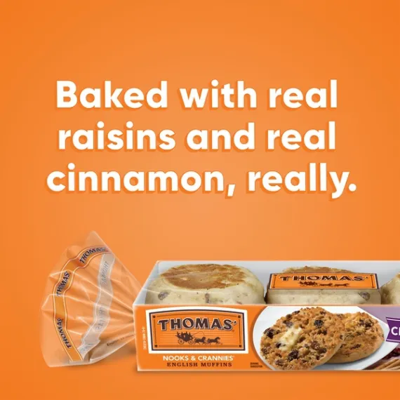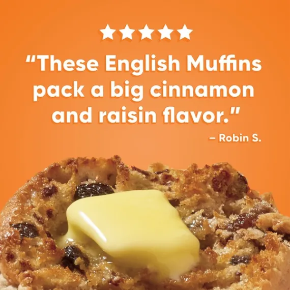 Details Ingredients Enriched Wheat Flour [Flour, Malted Barley Flour, Reduced Iron, Niacin, Thiamin Mononitrate (Vitamin B1), Riboflavin (Vitamin B2), Folic Acid], Water, Raisins, Sugar, Farina, Yeast, Cinnamon, Salt, Soybean Oil, Calcium Propionate (To Preserve Freshness), Sodium Stearoyl Lactylate, Xanthan Gum, Soy Lecithin, Soy, Whey. Show more Product features Thomas Cinnamon Raisin English Muffins have the butter pooling, Nooks & Crannies texture that you love. Simply like no other, theyre baked with real raisins and cinnamon to create a delicious taste you cant resist. Try them today and be part of a tradition of quality that Thomas has been proudly serving up to families like yours for more than 135 years. Each tray contains 6 fork-split delicious Cinnamon Raisin English Muffins Nooks & Crannies texture that toasts up crispy on the edges and soft in the middle Baked with high-quality ingredients, including real raisins and cinnamon Enjoy with your favorite spread (we suggest butter or cream cheese) or create a sweet treat for any time of day! Cholesterol Free Food; Low Fat; 0g Trans Fat; 3g Protein Special Features Kosher Net Quantity of Content 6.0 X 1 Muffin
