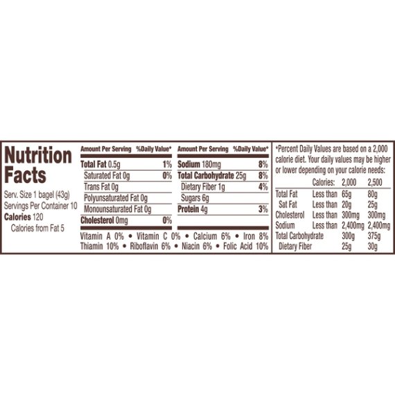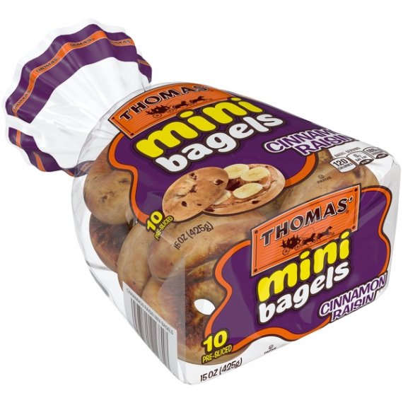 Details Ingredients Enriched Wheat Flour [Flour, Malted Barley Flour, Reduced Iron, Niacin, Thiamin Mononitrate (Vitamin B1), Riboflavin (Vitamin B2), Folic Acid], Water, Sugar, Raisins, Wheat Gluten, Yeast, Salt, Cinnamon, Caramel Color, Cornmeal, Calcium Propionate (To Preserve Freshness), Molasses, Monoglycerides, Soybean Oil, Cellulose Gum, Citric Acid, Xanthan Gum, Soy Lecithin. Show more Product features Sweeten up your day with a touch of cinnamon and juicy raisins in every mini bite. Perfect for little hands and big snacking, Thomas’ Cinnamon Raisin Mini Bagels have a soft and chewy texture you’ll love, with a delicious taste you can’t resist. A perfect snacksized version of the bagels you love. Try them today and be part of a tradition of quality that Thomas’ has been proudly serving up to families like yours for more than 135 years. 10 Thomas' Cinnamon Raisin Mini Bagels per package; ideal for a small meal or snack Crunchy on the outside and soft and chewy on the inside when toasted 0g trans fat per serving; no high-fructose corn syrup; a cholesterol-free food 120 calories per mini bagel Great toasted and topped with your favorite toppings or ingredients Special Features Cinnamon raisin Net Quantity of Content 5.0 X 2 bagels