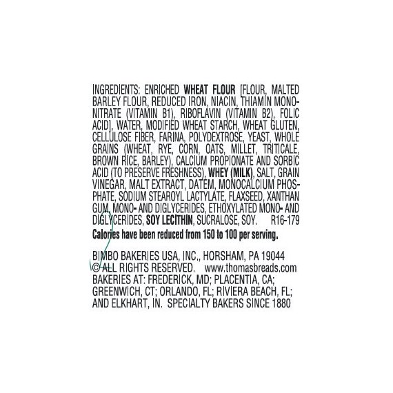 Details Ingredients Enriched Wheat Flour [Flour, Malted Barley Flour, Reduced Iron, Niacin, Thiamin Mononitrate (Vitamin B1), Riboflavin (Vitamin B2), Folic Acid], Water, Modified Wheat Starch, Wheat Gluten, Cellulose Fiber, Farina, Polydextrose, Yeast, Whole Grains (Wheat, Rye, Corn, Oats, Millet, Triticale, Brown Rice, Barley), Calcium Propionate And Sorbic Acid (To Preserve Freshness), Whey (Milk), Salt, Grain Vinegar, Malt Extract, Datem, Monocalcium Phosphate, Sodium Stearoyl Lactylate, Flaxseed, Xanthan Gum, Mono And Diglycerides, Ethoxylated Mono And Diglycerides, Soy Lecithin, Sucralose, Soy. Show more Product features Thomas Light Multi-Grain English Muffins have the butter pooling, Nooks & Crannies texture that you love. Simply like no other, they have 8 grams of fiber and 100 calories per serving along with a delicious taste you cant resist. Try them today and be part of a tradition of quality that Thomas has been proudly serving up to families like yours for more than 135 years. Each tray contains 6 fork-split Light Multi-Grain English Muffins Each delicious muffin has only 100 calories and is a great source of fiber Nooks & Crannies texture that toasts up crispy on the edges and soft in the middle Baked with high-quality ingredients Enjoy with your favorite spread (we suggest butter or cream cheese) or as a sandwich, burger, personal pizza and more! Create the perfect breakfast sandwich with sausage, eggs & cheese and a toasted Thomas' English Muffin Special Features No high fructose corn syrup Net Quantity of Content 6.0 X 1 muffin