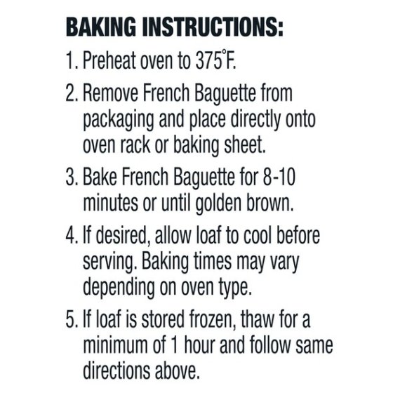 Details Ingredients ENRICHED FLOUR (WHEAT FLOUR, MALTED BARLEY FLOUR, NIACIN, REDUCED IRON, THIAMINE MONONITRATE, RIBOFLAVIN, FOLIC ACID), WATER, CONTAINS LESS THAN 2% OF DOUGH CONDITIONER (ENRICHED WHEAT FLOUR, ASCORBIC ACID, ENZYMES), MALT (MALTED BARLEY, WHEAT FLOUR, DEXTROSE), PRESERVATIVES (CULTURED WHEAT STARCH, WHEAT FLOUR, CITRIC ACID), SALT, VINEGAR, YEAST. Show more Product features Get the fresh baked taste you crave with the Marketside Bake at Home French Baguette. This freshly made bread has a fragrant, savory aroma that will make you feel like you are wandering the streets of France. Bake it at home in your own oven in just 7-9 minutes for a delicious fresh taste. The crispy crust provides a delightful, crunchy contrast to the soft, fluffy, chewy center. This versatile bread can be eaten as a delicious side to a pasta dinner, spread with garlic butter and broiled, made into authentic French toast, used to build delicious bruschetta appetizers, or made into a Vietnamese banh mi sandwich. Bring the fresh taste of France to your kitchen today with the Marketside Bake at Home French Baguette. Fresh ideas and quality ingredients, that's how Marketside brings the best foods to your table. We are committed to deliver freshness that you can taste and see. Marketside offers the best in fresh food, guaranteed by Walmart, working in partnership with farmers, bakers and chefs for the highest quality, authentic ingredients and favorite recipes. Marketside Bake at Home French Baguette, 10 oz: Bake at home Bakes in 7-9 minutes Crispy crust and a soft, fluffy center 10 oz Net Quantity of Content ABOUT 5 X 2 oz