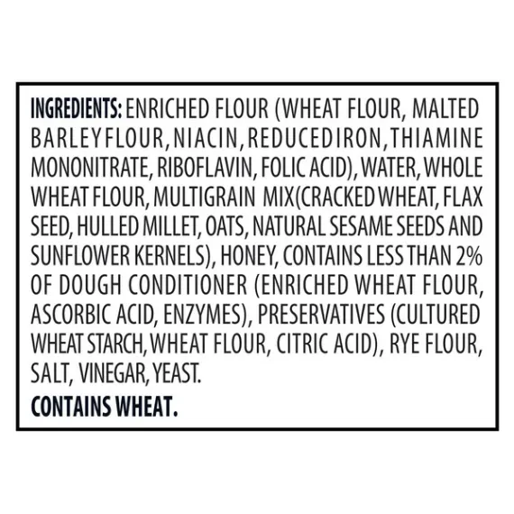Details Ingredients ENRICHED FLOUR (WHEAT FLOUR, MALTED BARLEY FLOUR, NIACIN, REDUCED IRON, THIAMINE MONONITRATE, RIBOFLAVIN, FOLIC ACID), WATER, WHOLE WHEAT FLOUR, MULTIGRAIN MIKRACKED WHEAT, FLAX SEED, HULLED MILLET, OATS, NATURAL SESAME SEEDS AND SUNFLOWER KERNELS), HONEY, CONTAINS LESS THAN 2% OF DOUGH CONDITIONER (ENRICHED WHEAT FLOUR, ASCORBIC ACID, ENZYMES), PRESERVATIVES (CULTURED WHEAT STARCH,WHEAT FLOUR, CITRIC ACID), RYE FLOUR, SALT, VINEGAR, YEAST. Show more Product features Marketside Bake at Home Multigrain Loaf is crafted with wholesome ingredients and packed with rich, authentic flavors. This bake at home loaf bakes in just 10-12 minutes, so you can enjoy fresh from the bakery taste in the comfort of your home. Slice it up and use to make delicious handcrafted sandwiches loaded with your favorite deli meats, cheeses, veggies, and condiments. Smear with butter and garlic to enjoy fresh multigrain garlic bread. Try it as a delicious appetizer with butter or olive oil mixed with your favorite Italian spices. You can even use it to make egg sandwiches or avocado toast for breakfast. Complete your favorite meals with the authentic taste of Marketside Bake at Home Multigrain Loaf. Fresh ideas and quality ingredients, that's how Marketside brings the best foods to your table. We are committed to deliver freshness that you can taste and see. Marketside offers the best in fresh food, guaranteed by Walmart, working in partnership with farmers, bakers and chefs for the highest quality, authentic ingredients and favorite recipes. Marketside Bake at Home Multigrain Loaf, 12 oz: Crafted with wholesome ingredients and packed with rich, authentic flavors Bake in the oven and in just 10-12 minutes enjoy fresh from the bakery taste in the comfort of your own home Use to make scrumptious sandwiches loaded with your favorite deli meats, cheese, and veggies Make yummy egg sandwiches or avocado toast for breakfast