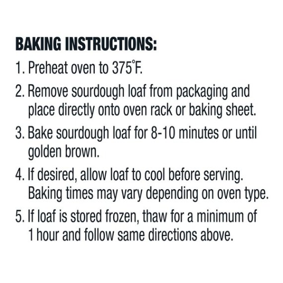Details Ingredients ENRICHED FLOUR (WHEAT FLOUR, MALTED BARLEY FLOUR, NIACIN, REDUCED IRON, THIAMINE MONONITRATE, RIBOFLAVIN, FOLIC ACID), WATER, WHOLE WHEAT FLOUR, CONTAINS LESS THAN 2% OF PRESERVATIVES (CULTURED WHEAT STARCH, WHEAT FLOUR, CITRIC ACID), SALT, VINEGAR, YEAST. Show more Product features Marketside Bake at Home Sourdough Loaf is crafted with wholesome ingredients and packed with rich, authentic flavors. This bake at home loaf bakes in less than 10 minutes, so you can enjoy fresh from the bakery taste in the comfort of your home. Enjoy it as a side with a hearty roast, grilled chicken, soup and more. Slice it up and use to make delicious handcrafted sandwiches. Smear with butter and garlic to enjoy fresh garlic bread. You can even enjoy it for breakfast with eggs and bacon or as a delicious avocado toast. Complete your favorite meals with the authentic taste of Marketside Bake at Home Sourdough Loaf. Fresh ideas and quality ingredients, that’s how Marketside brings the best foods to your table. We are committed to deliver freshness that you can taste and see. Marketside offers the best in fresh food, guaranteed by Walmart, working in partnership with farmers, bakers and chefs for the highest quality, authentic ingredients and favorite recipes. Marketside Bake at Home Sourdough Loaf, 10 oz: Crafted with wholesome ingredients and packed with rich, authentic flavors Bake in the oven and in less than 10 minutes enjoy fresh from the bakery taste in the comfort of your own home Use it to make scrumptious sandwiches, garlic bread, avocado toast and more Enjoy as a side with a hearty roast, grilled chicken and veggies, or a yummy soup Net Quantity of Content ABOUT 5 X 2 oz