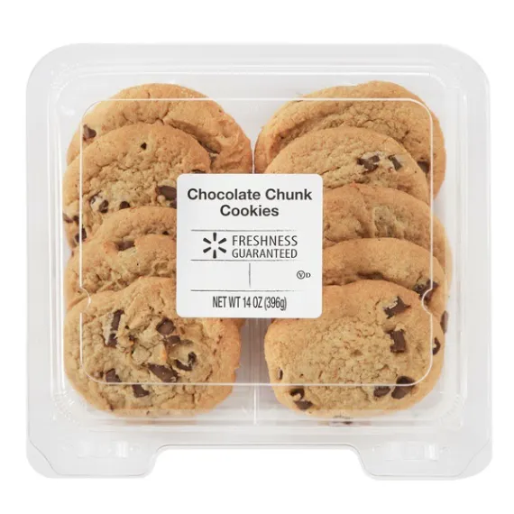 Details Ingredients WHEAT FLOUR, SEMI-SWEET CHOCOLATE (SUGAR, UNSWEETENED CHOCOLATE, DEXTROSE, COCOA BUTTER, SOY LECITHIN [AN EMULSIFIER, BROWN SUGAR (SUGAR, MOLASSES), PALM OIL SHORTENING, SUGAR CANE SYRUP, BUTTER (CREAM [MILK], NATURAL FLAVORS), SUGAR, EGGS, NATURAL VANILLA FLAVOR, CORN STARCH, SALT, NATURAL FLAVOR, NATURAL AND ARTIFICIAL FLAVOR, SODIUM BICARBONATE (LEAVENING), MONOCALCIUM PHOSPHATE (LEAVENING). Show more Product features Freshness Guaranteed Chocolate Chunk Cookies are made with semisweet chocolate chunks for a big chocolate taste in every bite. These cookies are packaged in a reclosable container to help maintain freshness. The package contains ten buttery, soft cookies to keep in your pantry as a special treat or to share with family and friends after a meal together. These cookies are the perfect complement to a tall glass of cold milk or a hot cup of coffee. The container makes it easy to take these cookies with you to potlucks or gatherings with friends. Have a treat with Freshness Guaranteed Chocolate Chunk Cookies. Freshness Guaranteed provides you and your family with high-quality fresh food that saves you time and money, many of which are cooked fresh or prepared in stores. Convenient solutions with value added in every Spark Fresh item. Freshness Guaranteed Chocolate Chunk Cookies, 14 oz, 10 Count: Semisweet chocolate chunks Soft cookies Reclosable container 10 cookies