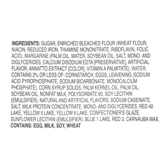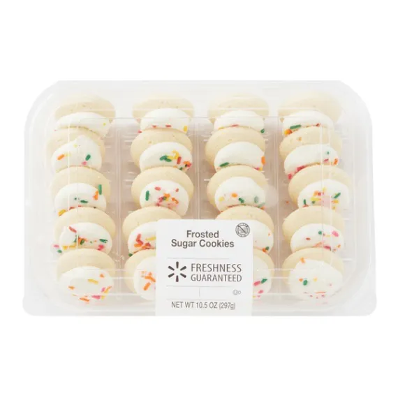 Details Ingredients SUGAR, ENRICHED BLEACHED FLOUR (WHEAT FLOUR, NIACIN. REDUCED IRON, THIAMINE MONONITRATE. RIBOFLAVIN. FOLIC ACID). MARGARINE (PALM OIL, WATER. SOYBEAN OIL, SALT. MONO- AND DIGLYCERIDES, CALCIUM DISODIUM EDTA [PRESERVATIVE]. ARTIFICIAL FLAVOR, ANNATTO EXTRACT [COLOR], VITAMIN A PALMITATE), WATER. CONTAINS 2% OR LESS OF: CORNSTARCH. EGGS. LEAVENING (SODIUM ACID PYROPHOSPHATE. SODIUM BICARBONATE. MONOCALCIUM PHOSPHATE). CORN SYRUP SOLIDS, PALM KERNEL OIL. PALM OIL, SOYBEAN OIL. NONFAT MILK, POLYSORBATE 60. SOY LECITHIN (EMULSIFIER), NATURAL AND ARTIFICIAL FLAVORS. SODIUM CASEINATE, SALT, MILK PROTEIN CONCENTRATE. MONO- AND DIGLYCERIDES. RED 40 LAKE, YELLOW 5 LAKE. YELLOW 6 LAKE, CONFECTIONER'S GLAZE, SUNFLOWER LECITHIN (EMULSIFIER), BLUE 1 LAKE, RED 3, CARNAUBA WAX Show more Product features Sweeten your day with a Freshness Guaranteed Mini White-Frosted Sugar Cookie. These soft, tasty cookies are topped with white frosting and colorful sprinkles for an added dash of fun. Each package comes with 20 fun, bite-sized treats that are perfect for snacking and entertaining, whether it’s for an office lunch, birthday party, family gathering, or any other occasion. These cookies come in an easy-to-open, resealable container to help maintain freshness between snacking sessions. Indulge in the sweet taste of Freshness Guaranteed Mini Frosted Sugar Cookies. Freshness Guaranteed provides you and your family with high-quality fresh food that saves you time and money, many of which are cooked fresh or prepared in stores. Convenient solutions with value added in every Spark Fresh item. Freshness Guaranteed Mini White-Frosted Sugar Cookies, 10.5 oz, 20 Count: Bite-sized cookies Topped with white frosting and colorful sprinkles 20 cookies per package Resealable container to maintain freshness Great addition to office parties, family gatherings, picnics, and more Delicious and festive Net Quantity of Content 10 X 2 cookies (30g)