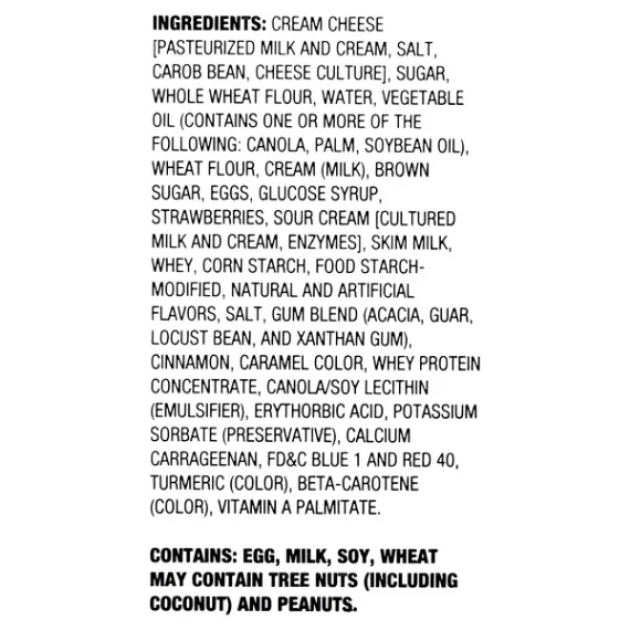 Details Ingredients CREAM CHEESE [CULTURED CREAM AND MILK, SALT, XANTHAN GUM, CAROB BEAN GUM, GUAR GUM], SUGAR, WHOLE WHEAT FLOUR, MARGARINE [PALM OIL, WATER, SOYBEAN OIL, SALT, MONO AND DIGLYCERIDES, SOY LECITHIN, SODIUM BENZOATE (PRESERVATIVE), CITRIC ACID, NATURAL AND ARTIFICIAL FLAVOR, BETA CAROTENE (COLOR), VITAMIN A PALMITATE, WHEY], MILK, PALM OIL, SOUR CREAM [CREAM, WATER, NONFAT DRY MILK, MODIFIED CORNSTARCH, GUAR GUM, LOCUST BEAN GUM, CARRAGEENAN, DISODIUM PHOSPHATE, SODIUM CITRATE AND BACTERIAL CULTURE], STRAWBERRY FILLING [WATER, SUGAR, STRAWBERRIES, MODIFIED CORNSTARCH, SALT, ERYTHORBIC ACID (PRESERVATIVE), POTASSIUM SORBATE (PRESERVATIVE), CALCIUM CARRAGEENAN, ARTIFICIAL FLAVOR, FD&C RED 40 & BLUE 1], WHEAT FLOUR, SOYBEAN OIL, CORN STARCH, DRIED EGGS, MODIFIED CORNSTARCH, NATURAL FLAVOR, SALT, XANTHAN GUM, LOCUST BEAN GUM, GUAR GUM, YELLOW 5 AND YELLOW 6 [WATER, SODIUM BENZOATE (PRESERVATIVE), CITRIC ACID], CINNAMON, BAKING SODA, APOCAROTENAL (COLOR). Show more Product features Freshness Guaranteed Strawberry Swirl Cheesecake is a masterpiece of incredibly rich and decadent cheesecake with the perfect amount of strawberry. The buttery, graham cracker crust will definitely melt in your mouth. Made from the highest quality ingredients, this strawberry swirl cheesecake will satisfy any sweet tooth. Cut a slice when you want to treat yourself to a delicious sweet snack or bring it to a dinner party. It's sure to be a showstopper amongst cheesecake lovers! Plus, the resealable container makes it easy to save and store for later. Dig in and satisfy your sweet tooth with Freshness Guaranteed Strawberry Swirl Cheesecake. Freshness Guaranteed provides you and your family with high-quality fresh food that saves you time and money, many of which are cooked fresh or prepared in stores. Convenient solutions with value added in every Spark Fresh item. Freshness Guaranteed Strawberry Swirl Cheesecake, 16 oz: Classically rich cheesecake swirled with real strawberry puree baked on a buttery graham cracker crust Baked with pride Only 220 calories per slice Bakery supply comes in a convenient resealable container Ideal dessert for small gatherings Contains egg, milk, soy and wheat Net Quantity of Content 8 X 57 g