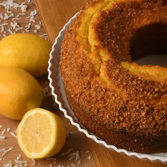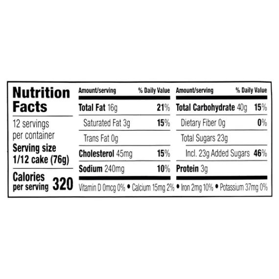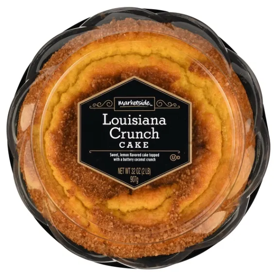 Details Ingredients Sugar, Water, Soybean, Bleached Wheat Flour, Eggs, Food Starch-Modified, Contains Less Than 2% Of Each Of The Following: Whey, Wheat Flour, Sodium Aluminum Phosphate, Baking Soda, Flaked Yellow Corn, Vital Wheat Gluten, Cornstarch, Coconut, Mono- And Diclycerides, Natural And Artificial Flavors, Dextrose, Soy Lecithin, Sodium Stearoyl Lactylate, Butter (Cream, Salt), Sodium Propionate (Preservative, Cellulose Gum, Annatto Extract Color, Caramel Color, Yellow 5, Enzymes, Turmeric Extract Color. Show more Product features Marketside Louisiana Crunch Cake is a delicious treat that is sure to satisfy your sweet tooth. This Bundt cake features a sweet lemon cake topped with a buttery coconut crunch to ensure a mouthful flavor in every bite. Marketside's Louisiana Crunch Cake can serve about 12 slices so there's plenty for everyone. It is perfect to serve as you entertain guests, bring to a friend's house, serve at a party, share with coworkers or for a delicious dessert to indulge in on any given day. For an extra special treat, serve with a scoop of creamy vanilla ice cream. This cake comes in a reclosable container to help maintain freshness for continued enjoyment. Make any day sweeter with a slice of Marketside Louisiana Crunch Cake. Fresh ideas and quality ingredients, that's how Marketside brings the best foods to your table. We are committed to deliver freshness that you can taste and see. Marketside offers the best in fresh food, guaranteed by Walmart, working in partnership with farmers, bakers and chefs for the highest quality, authentic ingredients and favorite recipes. Marketside Louisiana Crunch Cake, 32 oz: Sweet, lemon flavored cake Bundt cake Topped with a buttery coconut crunch Serves about 12 slices Reclosable container to help maintain freshness