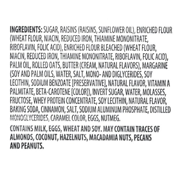 Details Ingredients INGREDIENTS: SUGAR, RAISINS (RAISINS, SUNFLOWER OIL), ENRICHED FLOUR (WHEAT FLOUR, NIACIN, REDUCED IRON, THIAMINE MONONITRATE, RIBOFLAVIN, FOLIC ACID), ENRICHED FLOUR BLEACHED (WHEAT FLOUR, NIACIN, REDUCED IRON, THIAMINE MONONITRATE, RIBOFLAVIN, FOLIC ACID), PALM OIL, ROLLED OATS, BUTTER (CREAM, NATURAL FLAVORS), MARGARINE (SOY AND PALM OILS, WATER, SALT, MONO- AND DIGLYCERIDES, SOY LECITHIN, SODIUM BENZOATE [PRESERVATIVE], NATURAL FLAVOR, VITAMIN A PALMITATE, BETA-CAROTENE [COLOR]), INVERT SUGAR, WATER, MOLASSES, FRUCTOSE, WHEY PROTEIN CONCENTRATE, SOY LECITHIN, NATURAL FLAVOR, BAKING SODA, CINNAMON, SALT, SODIUM ALUMINUM PHOSPHATE, DISTILLED MONOGLYCERIDES, CARAMEL COLOR, EGGS, NUTMEG Show more Product features The Marketside Ultimate Oatmeal Raisin Cookies are a great any-time dessert that quickly satisfies your sweet-tooth craving. Each cookie is baked fresh in-store for your grocery shopping convenience and are available in a three-pack, which means they are great to share with friends and family, or perfect for keeping them all to yourself. These soft, chewy cookies are full of raisins, which adds to the soft and chewy texture of the cookies, and are easily the perfect partner for a cold, tall glass of milk. Bring home the moist, delicious cookie everyone can enjoy with The Marketside Ultimate Oatmeal Raisin Cookies . Fresh ideas and quality ingredients, that's how Marketside brings the best foods to your table. We are committed to deliver freshness that you can taste and see. Marketside offers the best in fresh food, guaranteed by Walmart, working in partnership with farmers, bakers and chefs for the highest quality, authentic ingredients and favorite recipes. Marketside Ultimate Oatmeal Raisin Cookies: Baked fresh in-store Soft and chewy with delicious raisins Great with a glass of milk Three cookies per pack Net Quantity of Content 3 X 42 g