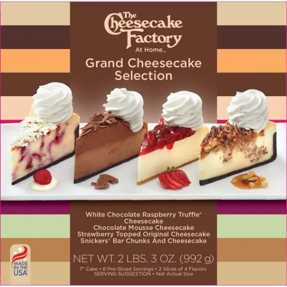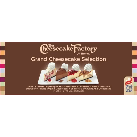 Details Ingredients CREAM CHEESE (PASTEURIZED MILK AND CREAM, CHEESE CULTURE, SALT, STABILIZERS [CAROB BEAN AND/OR XANTHAN AND/OR GUAR GUMS]), CREAM (NONFAT MILK, CARRAGEENAN, MONO AND DIGLYCERIDES, POLYSORBATE 80), SUGAR, CHOCOLATE CRUMB (WHEAT FLOUR, CANE SUGAR, PALM OIL, COCOA [PROCESSED WITH ALKALI], CARAMEL COLOR, SODIUM BICARBONATE, WHEY [MILK], SALT), WHOLE EGGS, SNICKERS BITS (MILK CHOCOLATE [SUGAR, COCOA BUTTER, CHOCOLATE, SKIM MILK, LACTOSE, MILKFAT, SOY LECITHIN, ARTIFICIAL FLAVOR], PEANUTS, CORN SYRUP, SUGAR, PALM OIL, SKIM MILK, LACTOSE, SALT, EGG WHITES, ARTIFICIAL FLAVOR), SOUR CREAM (PASTEURIZED GRADE A CULTURED MILK, CREAM, NONFAT MILK SOLIDS, ENZYMES), MARGARINE (PALM OIL, PALM FRACTIONS, WATER, SALT, EMULSIFIERS [SOYA LECITHIN, DISTILLED MONOGLYCERIDES], NATURAL BUTTER FLAVOR, CITRIC ACID [AS ANTIOXIDANT], VITAMIN A & BETA-CAROTENE), STRAWBERRY FILLING (STRAWBERRIES, SUGAR, WATER, MODIFIED CORN STARCH, NATURAL FLAVOR, CITRIC ACID, POTASSIUM SORBATE & SODIUM BENZOATE [PRESERVATIVES], SALT, AGAR, F.D. & C. RED NO. 40, F.D. & C. YELLOW NO. 5), SEMI-SWEET CHOCOLATE CHIPS (SUGAR, UNSWEETEENED CHOCOLATE, COCOA BUTTER, SOY LECITHIN [AS EMULSIFIER], ARTIFICIAL VANILLA FLAVOR), POWDERED SUGAR, GRAHAM CRUMB (WHEAT FLOUR, WHOLE WHEAT FLOUR, CANE SUGAR, PALM OIL, HONEY, SODIUM BICARBONATE, SALT), VANILLA CRUMB (WHEAT FLOUR, CANE SUGAR, PALM OIL, WHEY [MILK], SALT, SODIUM BICARBONATE, NATURAL BUTTER VANILLA FLAVOR), RASPBERRY PUREE (SUGAR, RED RASPBERRY PUREE, GLUCOSE SYRUP, RASPBERRY PUREE CONCENTRATE, COLORING FOOD [CONCENTRATES OF CARROT & BLACK CURRANT], PECTIN [GELLING AGENT], CITRIC ACID [ACIDIFIER], POTASSIUM SORBATE [PRESERVATIVE], CARMINE [COLOR], NATURAL FLAVOR), WHITE PASTEL COATING (SUGAR, PALM KERNEL OIL AND PALM OILS, WHEY, NONFAT MILK, TITANIUM DIOXIDE COLOR, SUNFLOWER LECITHIN, NATURAL FLAVOR, AND VANILLA), UNSWEETENED CHOCOLATE, CARAMEL (INVERT SUGAR, CREAM [CREAM, CARRAGEENAN, MONO-AND DIGLYCERIDES, POLYSORBATE 80], SUGAR), EGG WHITES, EGG YOLKS, BUTTER (CREAM), SEMISWEET CHOCOLATE (SUGAR, CHOCOLATE, COCOA BUTTER, MILKFAT, SOY LECITHIN [AS EMULSIFIER], ,ARTIFICIAL VANILLA FLAVOR, NATURAL FLAVORS), ARTIFICIAL VANILLA FLAVOR, WHITE COATING (SUGAR, FRACTIONATED PALM KERNEL OIL, WHEY POWDER, NONFAT MILK POWDER, SOY LECITHIN [EMULSIFIER], TITANIUM DIOXIDE [ARTIFICIAL COLOR], AND NATURAL FLAVORS), MILK CHOCOLATE (SUGAR, COCOA BUTTER, BELGIAN UNSWEETENED CHOCOLATE, WHOLE MILK POWDER, NONFAT DRY MILK, MILKFAT, SOY LECITHIN [EMULSIFIER], VANILLA EXTRACT), LIGHT CORN SYRUP (CORN SYRUP, SALT, VANILLA EXTRACT [VANILLA BEANS, WATER, ETHYL ALCOHOL]), CINNAMON, SALT, CREAM OF TARTAR. Show more Product features The Cheesecake Factory at Home - Grand Cheesecake Selection - 2 slices each of our White Chocolate Raspberry Truffle® Cheesecake, Snickers® Bar Chunks And Cheesecake, Chocolate Mousse Cheesecake and Strawberry Topped Original Cheesecake No Artificial Trans Fats No High Fructose Corn Syrup 7" Diameter, 8 Pre-Sliced Servings, 35oz Cake 6g of Protein per Serving Includes 4 popular flavors from our famous restaurants 2 Slices each of 4 Flavors - The perfect item for sharing! Net Quantity of Content 8 X 124 g