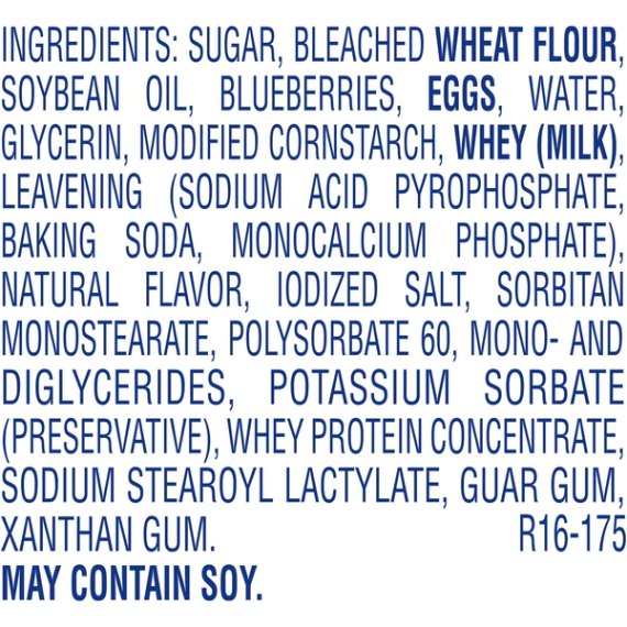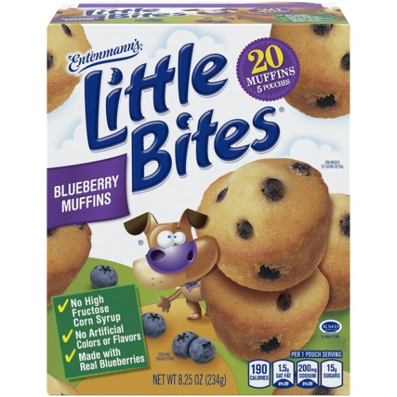 Details Ingredients Sugar, Bleached Wheat Flour, Soybean Oil, Eggs, Blueberries, Water, Glycerin, Modified Cornstarch, Whey, Leavening (Sodium Acid Pyrophosphate, Baking Soda, Monocalcium Phosphate), Natural Flavor, Salt, Mono And Diglycerides, Sorbitan Monostearate, Polysorbate 60, Preservatives (Phosphoric Acid, Sodium Propionate, Potassium Sorbate), Sodium Stearoyl Lactylate, Xanthan Gum, Cellulose Gum, Whey Protein Concentrate. Show more Product features Entenmanns Blueberry Little Bites are tasty little muffins that pack a big blueberry taste, sized perfectly for your lunchbox or snack. These bite-sized muffins combine our signature golden muffin recipe with the mouth-watering deliciousness of real blueberries! Just the right size, it makes the perfect snack at home or on-the-go. Since first being introduced in 1999, more than 10 billion Entenmanns Little Bites snacks have been lovingly baked soft and moist in our innovative portable pouch of good-choice deliciousness. Its all part of a tradition of quality that is found in every Entenmanns product baked with care every day. Grab a box for your next party, sporting event, or snack! Contains five (5) pouches of delicious mini muffins. Each pouch contains 4 muffins for a total of 20 muffins per box! These bite-sized muffins are the perfect combination of our signature golden muffin and delicious, REAL blueberries! Pre-portioned and portable pouches make the perfect snack at home or on-the-go, ideal for busy families Miniature in size, not in taste! Contains no High Fructose Corn Syrup or artificial colors. 0g trans fat Net Quantity of Content 5.0 X 1 pouch