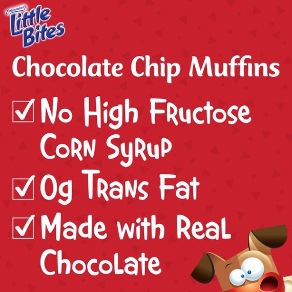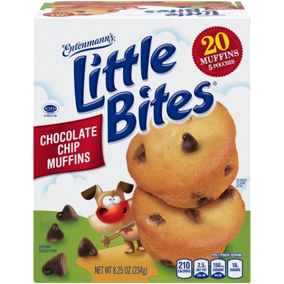 Details Ingredients Sugar, Bleached Wheat Flour, Water, Chocolate Chips [Sugar, Chocolate Liquor, Dextrose, Cocoa Butter, Soy Lecithin, Vanilla Extract], Soybean Oil, Eggs, Modified Cornstarch, Dextrose, Whey, Fructose, Glycerin, Leavening (Sodium Acid Pyrophosphate, Baking Soda, Monocalcium Phosphate), Artificial Flavor, Mono And Diglycerides, Salt, Sorbitan Monostearate, Polysorbate 60, Preservatives (Phosphoric Acid, Sodium Propionate, Potassium Sorbate), Sodium Stearoyl Lactylate, Xanthan Gum, Cellulose Gum. Whey Protein Concentrate. Show more Product features Entenmanns Chocolate Chip Little Bites are perfectly soft and sweet, mini in size, not in taste. These bite-sized muffins combine our signature golden muffin recipe with the mouth-watering deliciousness of real chocolate chips! Just the right size, it makes the perfect snack at home or on-the-go. Since first being introduced in 1999, more than 10 billion Entenmanns Little Bites snacks have been lovingly baked soft and moist in our innovative portable pouch of good-choice deliciousness. Its all part of a tradition of quality that is found in every Entenmanns product baked with care every day. Grab a box for your next party, sporting event, or snack! Contains five (5) pouches of delicious, rich mini muffins. Each pouch contains 4 muffins for a total of 20 muffins per box! These bite-sized muffins are made with the mouth-watering deliciousness of real chocolate chips! Pre-portioned and portable pouches make the perfect snack at home or on-the-go, ideal for busy families. Miniature in size, not in taste! Contains no High Fructose Corn Syrup or Artificial Colors 0g trans fat Special Features Good source of calcium Net Quantity of Content 5.0 X 1 pouch