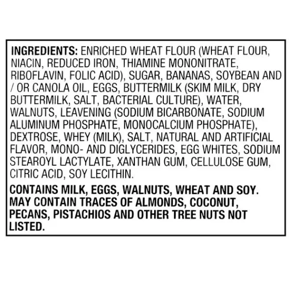 Details Ingredients ENRICHED WHEAT FLOUR (WHEAT FLOUR, NIACIN, REDUCED IRON, THIAMINE MONONITRATE, RIBOFLAVIN, FOLIC ACID), SUGAR, BANANAS, SOYBEAN AND/OR CANOLA OIL, EGGS, WALNUTS, BUTTERMILK (PART-SKIM MILK, SEA SALT, SODIUM CITRATE, BACTERIAL CULTURE), WATER, LEAVENING (SODIUM BICARBONATE, SODIUM ALUMINUM PHOSPHATE, MONOCALCIUM PHOSPHATE), DEXTROSE, WHEY (MILK), SALT, NATURAL AND ARTIFICIAL FLAVOR, MONO- AND DIGLYCERIDES, EGG WHITES, SODIUM STEAROYL LACTYLATE, XANTHAN GUM, CELLULOSE GUM, CITRIC ACID, SOY LECITHIN. Show more Product features Freshness Guaranteed Banana Nut Muffins are a great and easy way to get your fill in the morning without actually having to spend time prepping ingredients. These muffins are perfect for a cup of coffee or glass of milk either in the morning or for an afternoon snack. They are made with naturally and artificial flavors, and include plenty of nuts on top for a crunchy, yummy flavor that mixes well with bananas. Be prepared for your next bakery event with Freshness Guaranteed Banana Muffins. Freshness Guaranteed provides you and your family with high-quality fresh food that saves you time and money, many of which are cooked fresh or prepared in stores. Convenient solutions with value added in every Spark Fresh item. The Bakery At Walmart Banana Nut Muffins, 4 count Perfect for your next convenient breakfast Can be refrigerated to last longer Great with coffee or milk Plenty of crunchy nuts on top Net Quantity of Content 4 X 99 g