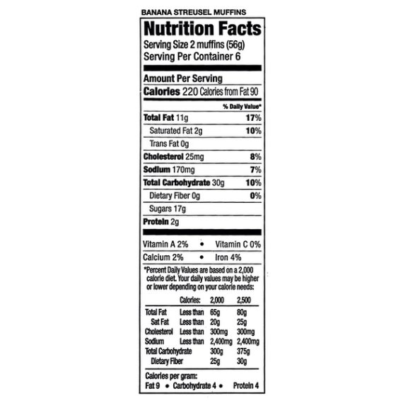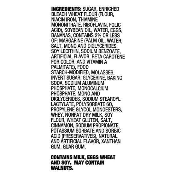 Details Ingredients SUGAR, ENRICHED BLEACH WHEAT FLOUR (FLOUR, NIACIN IRON, THIAMINE MONONITRATE, RIBOFLAVIN, FOLIC ACID), SOYBEAN OIL, WATER, EGGS, BANANAS, CONTAINS 2% OR LESS OF: MARGARINE (PALM OIL, WATER, SALT, MONO AND DIGLYCERIDES, SOY LECITHIN, SODIUM BENZOATE, ARTIFICIAL FLAVOR, BETA CAROTENE FOR COLOR, AND VITAMIN A PALM1TATE), FOOD STARCH-MODIFIED, MOLASSES, INVERT SUGAR, GLYCERINE, BAKING SODA, SODIUM ALUMINUM PHOSPHATE, MONOCALCIUM PHOSPHATE, MONO AND DIGLYCERIDES, SODIUM STEAROYL LACTYLATE, POLYSORBATE 60, PROPYLENE GLYCOL MONOESTERS, WHEY, NONFAT DRY MILK, SOY FLOUR, WHEAT GLUTEN, SALT, CINNAMON, SODIUM PROPIONATE, POTASSIUM SORBATE AND SORBIC ACID (PRESERVATIVES), NATURAL AND ARTIFICIAL FLAVOR, XANTHAN GUM, GUAR GUM. Show more Product features Freshness Guaranteed Banana Streusel Muffins are great any-time sweet treat that quickly satisfies your sweet-tooth craving. These exquisite muffins are moist and soft, loaded with real banana and topped with a delicious cinnamon streusel. Try these muffins for breakfast with a hot cup of coffee or tea, as a sweet snack with a tall, cold glass of milk, or as a scrumptious dessert after dinner. Conveniently packaged with 12 mini muffins per pack in a resealable container that maintain freshness, these muffins are perfect to share with friends and family or save and savor by yourself. Bring home the Freshness Guaranteed Banana Streusel Muffins today!s. Freshness Guaranteed provides you and your family with high-quality fresh food that saves you time and money, many of which are cooked fresh or prepared in stores. Convenient solutions with value added in every Spark Fresh item. Freshness Guaranteed Banana Streusel Mini Muffins, 12 oz, 12 Count: Scrumptious mini muffins loaded with real banana and topped with a cinnamon streusel Perfect for breakfast, as a sweet snack, or as a yummy dessert Great with coffee, tea, or milk Peanut free