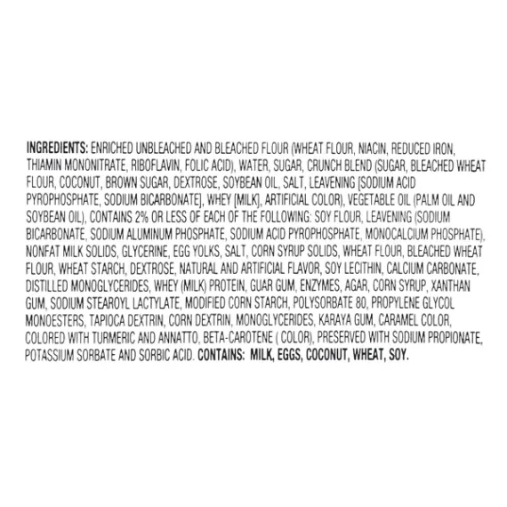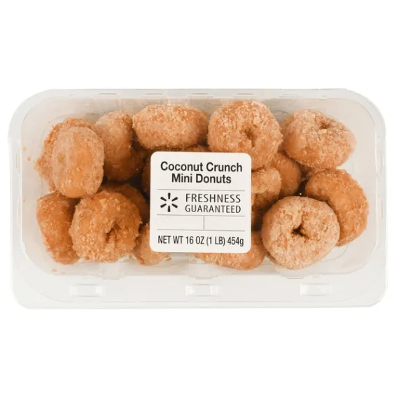 Details Ingredients Enriched Unbleached And Bleached Flour (Wheat Flour, Niacin, Reduced Iron, Thiamin Mononitrate, Riboflavin, Folic Acid), Water, Sugar, Crunch Blend (Sugar, Bleached Wheat Flour, Coconut, Brown Sugar, Dextrose, Soybean Oil, Salt, Leavening [Sodium Acid Pyrophosphate, Sodium Bicarbonate], Whey [Milk], Artificial Color), Vegetable Oil (Palm Oil And Soybean Oil), Contains 2% Or Less Of Each Of The Following: Soy Flour, Leavening (Sodium Bicarbonate, Sodium Aluminum Phosphate, Sodium Acid Pyrophosphate, Monocalcium Phosphate), Nonfat Milk Solids, Glycerine, Egg Yolks, Salt, Corn Syrup Solids, Wheat Flour, Bleached Wheat Flour, Wheat Starch, Dextrose, Natural And Artificial Flavor, Soy Lecithin, Calcium Carbonate, Distilled Monoglycerides, Whey (Milk) Protein, Guar Gum, Enzymes, Agar, Corn Syrup, Xanthan Gum, Sodium Stearoyl Lactylate, Modified Corn Starch, Polysorbate 80, Propylene Glycol Monoesters, Tapioca Dextrin, Corn Dextrin, Monoglycerides, Karaya Gum, Caramel Color, Colored With Turmeric And Annatto, Beta-Carotene ( Color), Preserved With Sodium Propionate, Potassium Sorbate And Sorbic Acid Show more Product features Enjoy a sweet treat with Freshness Guaranteed Coconut Crunch Mini Donuts. These treats feature a moist, rich donut covered in sweet, crunchy coconut. Freshness Guaranteed coconut crunch donuts are a great addition to any breakfast table. They're easy to grab on the go and enjoy with a fresh cup of coffee or a glass of cold milk. These coconut crunch mini donuts are perfect for a tasty snack, to serve as you entertain guests, bring to a friend's house, share with coworkers or for a delicious treat to indulge in on any given day. This box comes with about 18 donuts so there is plenty for everyone. They come in an easy open/close contain to help maintain freshness for continued enjoyment. Satisfy your sweet tooth with Freshness Guaranteed Coconut Crunch Mini Donuts. Freshness Guaranteed provides you and your family with high-quality fresh food that saves you time and money, many of which are cooked fresh or prepared in stores. Convenient solutions with value added in every Spark Fresh item. p> Freshness Guaranteed Coconut Crunch Mini Donuts, 16 oz: Moist, rich donut covered in sweet, crunchy coconut Contains about 18 donuts Delicious sweet treat Perfect for serving guests Great to bring to a friend's house Easy open/close contain to help maintain freshness Net Quantity of Content 9 X 2 Donuts (50g/1.8oz)