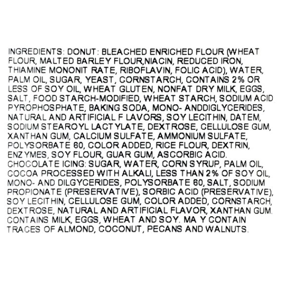 Details Ingredients Donut: Bleached Enriched Flour (Wheat Flour, Malted Barley Flour, Niacin, Reduced Iron, Thiamine Mononitrate, Riboflavin, Folic Acid), Water, Palm Oil, Sugar, Yeast, Cornstarch, Contains 2% Or Less Of Soy Oil, Wheat Gluten, Nonfat Dry Milk, Eggs, Salt, Food Starch-Modified, Wheat Starch, Sodium Acid Pyrophosphate, Baking Soda, Mono- And Diglygerides, Natural And Artificial Flavors, Soy Lecithin, Datem, Sodium Stearoyl Lactylate, Dextrose, Cellulose Gum, Xanthan Gum, Calcium Sulfate, Ammonium Sulfate, Polysorbate 60, Color Added, Rice Flour, Dextrin, Enzymes, Soy Flour, Guar Gum, Ascorbic Acid. Chocolate Icing: Sugar, Water, Corn Syrup, Palm Oil, Cocoa Processed With Alkali, Less Than 2% Of Soy Oil, Mono- And Dilgycerides, Polysorbate 60, Salt, Sodium Propionate (Preservative), Sorbic Acid (Preservative), Soy Lecithin, Cellulose Gum, Color Added, Cornstarch, Dextrose, Natural And Artificial Flavor, Xanthan Gum Show more Product features Enjoy the sweet taste of Freshness Guaranteed Chocolate Donuts. These donuts have a light, dough bottom that is topped with a delicious chocolate frosting. Freshness Guaranteed chocolate donuts are a great addition to any breakfast table. They're easy to grab on the go and enjoy with a fresh cup of coffee or a glass of cold milk. These donuts are also perfect to serve as you entertain guests, bring to a friend's house, serve at a party, share with coworkers or for a delicious treat to indulge in on any given day. This box comes with six chocolate donuts so there is plenty for everyone. They come in a reclosable box to help maintain freshness between snacking. Treat yourself to one of Freshness Guaranteed Chocolate Donuts. Freshness Guaranteed provides you and your family with high quality fresh food that save you time and money, many of which are cooked fresh or prepared in stores. Convenient solutions with value added in every Spark Fresh item. Freshness Guaranteed Donuts with Chocolate Icing, 6 Count: Grab on the go and enjoy with a cup of coffee Dough bottom topped with delicious chocolate frosting Great addition to the breakfast table Reclosable box to help maintain freshness