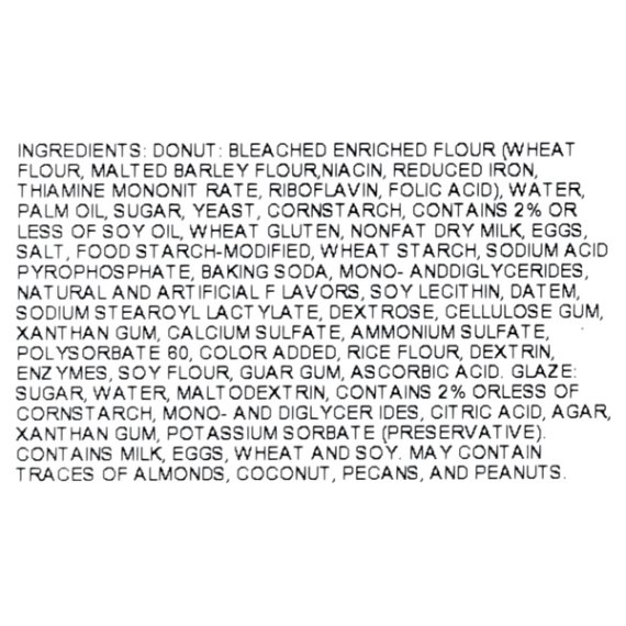 Details Ingredients Donut: Bleached Enriched Flour (Wheat Flour, Malted Barley Flour, Niacin, Reduced Iron, Thiamine Mononitrate, Riboflavin, Folic Acid), Water, Palm Oil, Sugar, Yeast, Cornstarch, Contains 2% Or Less Of Soy Oil, Wheat Gluten, Nonfat Dry Milk, Eggs, Salt, Food Starch-Modified, Wheat Starch, Sodium Acid Pyrophosphate, Baking Soda, Mono- And Diglycerides, Natural And Artificial Flavors, Soy Lecithin, Datem, Sodium Stearoyl Lactylate, Dextrose, Cellulose Gum, Xanthan Gum, Calcium Sulfate, Ammonium Sulfate, Polysorbate 60, Color Added, Rice Flour, Dextrin, Enzymes, Soy Flour, Guar Gum, Ascorbic Acid. Glaze: Sugar, Water, Maltodextrin, Contains 2% Or Less Of Cornstarch, Mono- And Diglycerides, Citric Acid, Agar, Xanthan Gum, Potassium Sorbate (Preservative). Show more Product features Enjoy the sweet taste of Freshness Guaranteed Glazed Donuts. These donuts feature a light dough that coated with a sweet glaze. Freshness Guaranteed donuts are a great addition to any breakfast table. They're easy to grab on the go and enjoy with a fresh cup of coffee or a glass of cold milk. These donuts are also perfect to serve as you entertain guests, bring to a friend's house, serve at a party, share with coworkers or for a delicious treat to indulge in on any given day. This box comes with 12 glazed donuts so there is plenty to share. The donuts come in a reclosable box to help maintain freshness between snacking. Treat yourself to one of Freshness Guaranteed Glazed Donuts. Freshness Guaranteed provides you and your family with high quality fresh food that save you time and money, many of which are cooked fresh or prepared in stores. Convenient solutions with value added in every Spark Fresh item. Freshness Guaranteed Glazed Donuts, 12 Count: Grab on the go and enjoy with a cup of coffee Donut coated with sweet glaze Great addition to the breakfast table Reclosable box to help maintain freshness Allergy Notice Our stores may use some of the following ingredients: peanuts, eggs, soy, tree nuts, wheat, dairy products, fish, and/or shellfish. Even if these are not listed on the ingredient label, please be aware that all products may have come in contact with these ingredients.