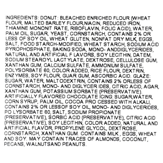 Details Ingredients Donut: Bleached Enriched Flour (Wheat Flour, Malt Ed Barley Flour, Niacin, Reduced Iron, Thiamine Mononitrate, Riboflavin, Folic Acid), Water, Palm Oil, Sugar, Yeast, Cornstarch, Contains 2% Or Less Of Soy Oil, Wheat Gluten, Nonfat Dry Milk, Eggs, Salt, Food Starch-Modified, Wheat Starch, Sodium Acid Pyrophosphate, Baking Soda, Mono- And Diglycerides, Natural And Artificial Flavors, Soy Lecithin, Datem, Sodium Stearoyl Lactylate, Dextrose, Cellulose Gum, Xanthan Gum, Calcium Sulfate, Ammonium Sulfate, Polysorbate 60, Color Added, Rice Flour, Dextrin, Enzymes, Soy Flour, Guar Gum, Ascorbic Acid. Glaze: Sugar, Water, Maltodextrin, Contains 2% Or Less Of Cornstarch, Mono- And Diglycerides, Citric Acid, Agar, Xanthan Gum, Potassium Sorbate (Preservative). Artificially Flavored Chocolate Icing: Sugar, Water, Corn Syrup, Palm Oil, Cocoa Processed With Alkali, Contains 2% Or Less of Soy Oil, Mono- And Diglycerides, Polysorbate 60, Salt, Sodium Propionate (Preservative), Sorbic Acid (Preservative), Citric Acid (Preservative), Soy Lecithin, Color Added, Natural And Artificial Flavor, Propylene Glycol, Dextrose, Cornstarch, Xanthan Gum Show more Product features Enjoy the sweet taste of Freshness Guaranteed Chocolate Iced and Glazed Donuts. This box features 6 chocolate iced donuts and 6 donuts coated with a sweet glaze. Freshness Guaranteed donuts are a great addition to any breakfast table. They're easy to grab on the go and enjoy with a fresh cup of coffee or a glass of cold milk. These sweet treats are also perfect to serve as you entertain guests, bring to a friend's house, serve at a party, share with coworkers or for a delicious treat to indulge in on any given day. This box comes with a total of 12 donuts so there is plenty to share. The tasty treats come in a reclosable box to help maintain freshness between snacking. Treat yourself to one of Freshness Guaranteed Chocolate Iced and Glazed Donuts. Freshness Guaranteed provides you and your family with high quality fresh food that save you time and money, many of which are cooked fresh or prepared in stores. Convenient solutions with value added in every Spark Fresh item. Freshness Guaranteed Chocolate Iced and Glazed Donuts, 12 Count: 6 Chocolate iced donuts 6 Glazed donuts Grab on the go and enjoy with a cup of coffee Great addition to the breakfast table Reclosable box to help maintain freshness