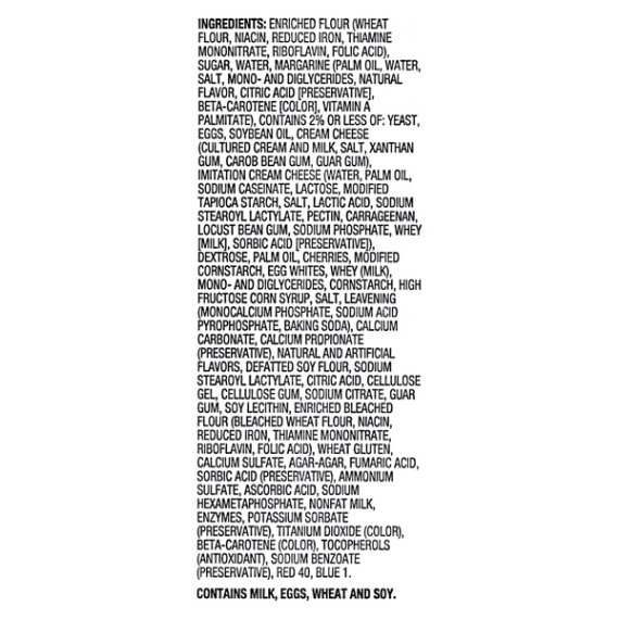 Details Ingredients Enriched Flour (Wheat Flour, Niacin, Reduced Iron, Thiamine Mononitrate, Riboflavin, Folic Acid), Sugar, Water, Margarine (Palm Oil, Water, Salt, Mono- And Diglycerides, Natural Flavor, Citric Acid (Preservative), Beta-Carotene (Color), Vitamin A Palmitate), Contains 2% Or Less Of: Yeast, Eggs, Soybean Oil, Cream Cheese (Cultured Cream And Milk, Salt, Xanthan Gum, Carob Bean Gum Guar Gum), Imitation Cream Cheese (Water, Palm Oil, Sodium Caseinate, Lactose, Modified Tapioca Starch, Salt, Lactic Acid, Sodium Stearoyl Lactute, Pectin, Carrageenan Locust Bean Gum, Sodium Phosphate, Whey (Milk), Sorbic Acid (Preservative)), Dextrose, Palm Oil, Cherries, Modified Cornstarch, Egg Whites, Whey (Milk), Mono- And Diglycerides, Cornstarch, High Fructose Corn Syrup, Salt, Leavening (Monocalcium Phosphate, Sodium Acid Pyrophosphate, Baking Soda), Calcium Carbonate, Calcium Propionate (Preservative), Natural And Artificial Flavors, Defatted Soy Flour, Sodium Stearoyl Lactylate, Citric Acid, Cellulose Gel, Cellulose Gum, Sodium Citrate, Guar Gum, Soy Lecithin, Enriched Bleached Flour (Bleached Wheat Flour, Niacin, Reduced Iron, Thiamine Mononitrate, Riboflavin, Folic Acid), Wheat Gluten, Calcium Sulfate, Agar-Agar, Fumaric Acid, Sorbic Acid (Preservative), Ammonium Sulfate, Ascorbic Acid, Sodium Hexametaphosphate, Nonfat Milk, Enzymes, Potassium Sorbate (Preservative), Titanium Dioxide (Color), Beta-Carotene (Color), Tocopherols (Antioxidand, Sodium Benzoate (Preservative), Red 40, Blue 1. Show more Product features Great Value Cherry Cheese Danish is a delicious puffed pastry with a cream cheese and cherry filling inside and topped with sweet frosting. Satisfy those between-the-meal cravings with a delicious Cherry Cheese Danish. These are ideal for breakfast or as a savory snack item for any social gathering, office, school or home. Bite into the soft dough with the smooth blend of cheese and cheery that will be a delight to your taste buds. This box comes with six individually wrapped pastries for your convenience. Make snack time a little sweeter with the addition of Great Value Cherry Cheese Danish. Great Value products provide families with affordable, high quality grocery and household consumable options. With our wide range of product categories spanning grocery and household consumables, we offer you a variety of products for your family's needs. Our products are conveniently available online and in Walmart stores nationwide, allowing you to stock up and save money at the same time. Great Value Net Quantity of Content 6 X 78 g