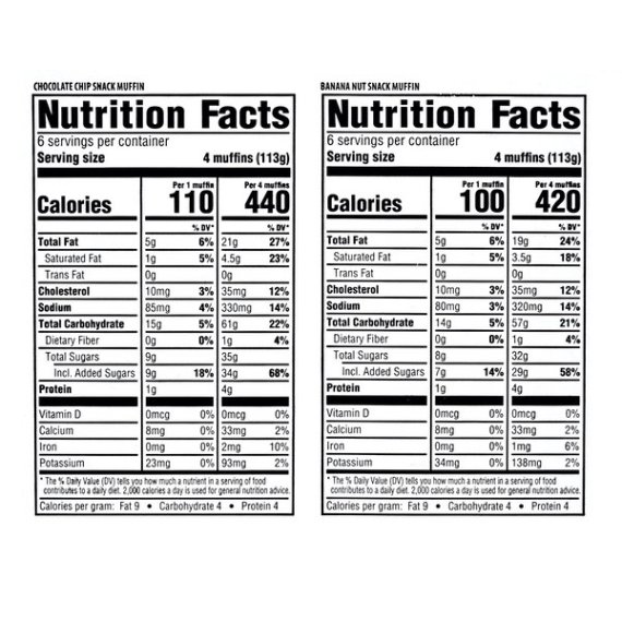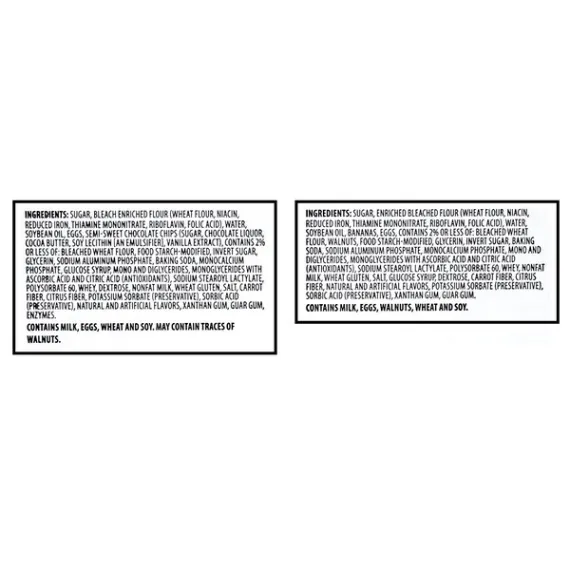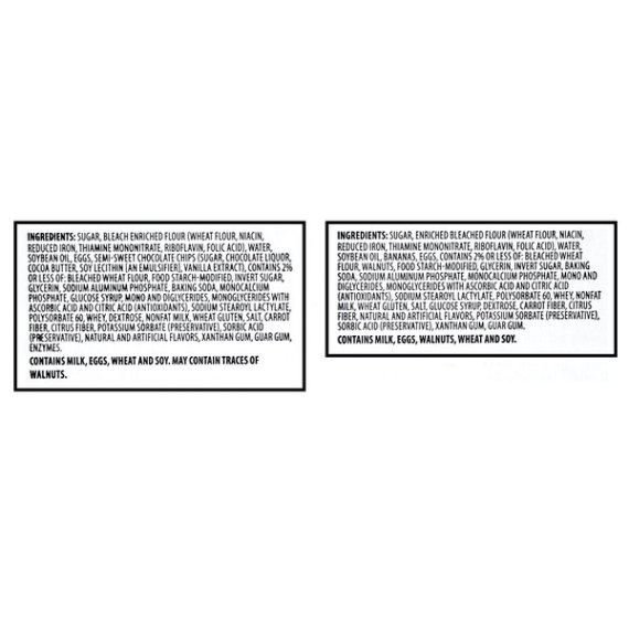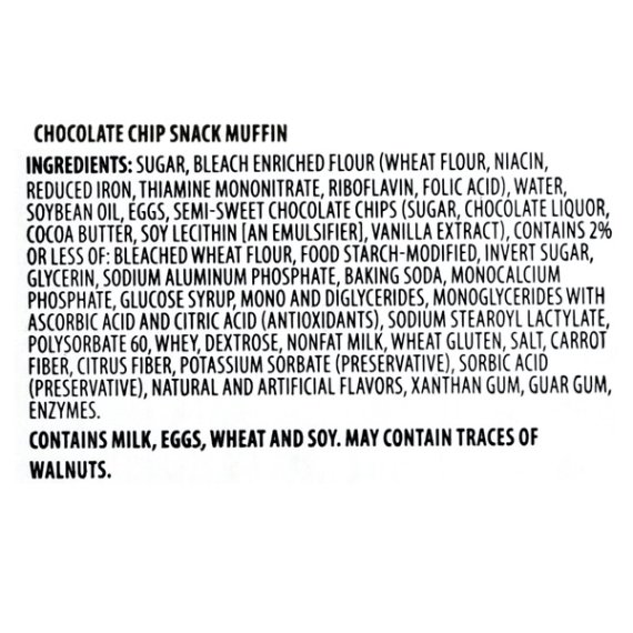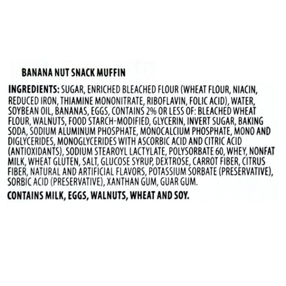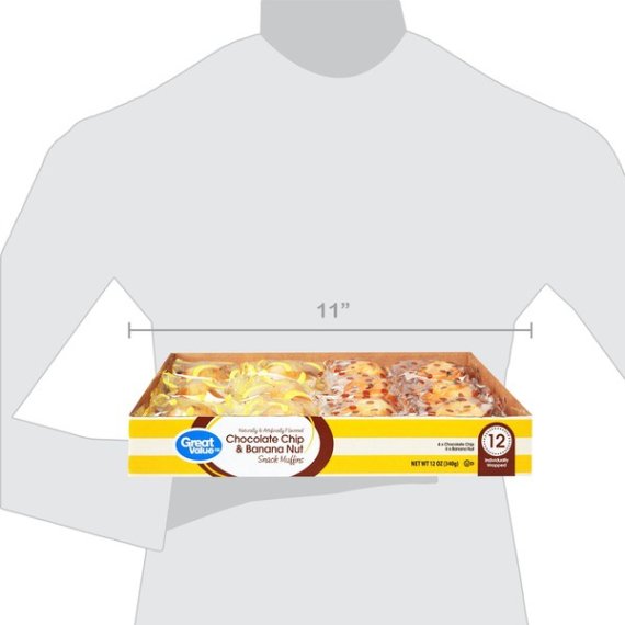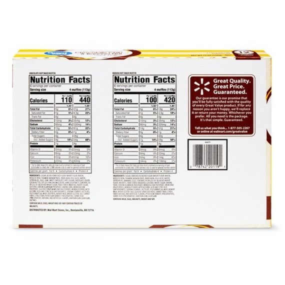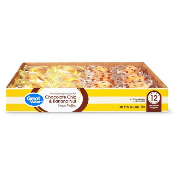 Details Ingredients BANANA NUT SNACK MUFFIN INGREDIENTS: SUGAR, ENRICHED BLEACHED FLOUR (WHEAT FLOUR, NIACIN, REDUCED IRON, THIAMINE MONONITRATE, RIBOFLAVIN, FOLIC ACID), WATER, SOYBEAN OIL, BANANAS, EGGS, CONTAINS 2% OR LESS OF: BLEACHED WHEAT FLOUR, WALNUTS, FOOD STARCH-MODIFIED, GLYCERIN, INVERT SUGAR, BAKING SODA, SODIUM ALUMINUM PHOSPHATE, MONOCALCIUM PHOSPHATE, MONO AND DIGLYCERIDES, MONOGLYCERIDES WITH ASCORBIC ACID AND CITRIC ACID (ANTIOXIDANTS), SODIUM STEAROYL LACTYLATE, POLYSORBATE 60, WHEY, NONFAT MILK, WHEAT GLUTEN, SALT, GLUCOSE SYRUP, DEXTROSE, CARROT FIBER, CITRUS FIBER, NATURAL AND ARTIFICIAL FLAVORS, POTASSIUM SORBATE (PRESERVATIVE), SORBIC ACID (PRESERVATIVE), XANTHAN GUM, GUAR GUM. CHOCOLATE CHIP SNACK MUFFIN INGREDIENTS: SUGAR, BLEACH ENRICHED FLOUR (WHEAT FLOUR, NIACIN, REDUCED IRON, THIAMINE MONONITRATE, RIBOFLAVIN, FOLIC ACID), WATER, SOYBEAN OIL, EGGS, SEMI-SWEET CHOCOLATE CHIPS (SUGAR, CHOCOLATE LIQUOR, COCOA BUTTER, SOY LECITHIN (AN EMULSIFIER], VANILLA EXTRACT), CONTAINS 2% OR LESS OF: BLEACHED WHEAT FLOUR, FOOD STARCH-MODIFIED, INVERT SUGAR, GLYCERIN, SODIUM ALUMINUM PHOSPHATE, BAKING SODA, MONOCALCIUM PHOSPHATE, GLUCOSE SYRUP, MONO AND DIGLYCERIDES, MONOGLYCERIDES WITH ASCORBIC ACID AND CITRIC ACID (ANTIOXIDANTS), SODIUM STEAROYL LACTYLATE, POLYSORBATE 60, WHEY, DEXTROSE, NONFAT MILK, WHEAT GLUTEN, SALT, CARROT FIBER, CITRUS FIBER, POTASSIUM SORBATE (PRESERVATIVE), SORBIC ACID (PRESERVATIVE), NATURAL AND ARTIFICIAL FLAVORS, XANTHAN GUM, GUAR GUM, ENZYMES. Show more Product features Great Value brings you delicious Chocolate Chip and Banana Nut Snack Muffins in a decorative variety pack. These muffins have a light, airy texture that melts in your mouth and delivers a burst of fruity goodness. The variety pack makes it easy to please the whole family. These delicious muffins are perfect for satisfying sweet tooth cravings, and deliver the ultimate treat to your taste buds. Serve them with your morning coffee or simply enjoy with a glass of cold milk. This box comes with six Chocolate Chip muffins and six Banana Nut muffins individually wrapped for your convenience. Indulge yourself with the rich flavors of Great Value Chocolate Chip and Banana Nut Snack Muffins. Great Value products provide families with affordable, high quality grocery and household consumable options. With our wide range of product categories spanning grocery and household consumables, we offer you a variety of products for your family's needs. Our products are conveniently available online and in Walmart stores nationwide, allowing you to stock up and save money at the same time. Great Value Chocolate Chip & Banana Nut Snack Muffins, 12 oz, 12 Count: 6 Chocolate Chip muffins and 6 Banana nut muffins Perfect sweet treat anytime of the day Naturally and artificially flavored Individually wrapped Great with coffee Net weight 12 oz
