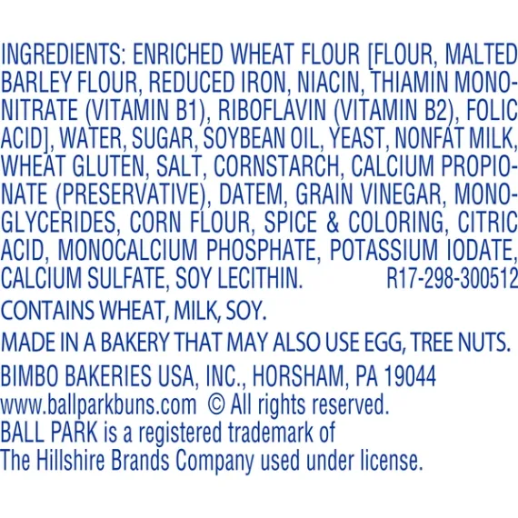 Details Ingredients Enriched Wheat Flour [Flour, Malted Barley Flour, Reduced Iron, Niacin, Thiamin Mononitrate (Vitamin B1), Riboflavin (Vitamin B2), Folic Acid], Water, Sugar, Soybean Oil, Yeast, Nonfat Milk, Wheat Gluten, Salt, Cornstarch, Calcium Propionate (Preservative), Datem, Grain Vinegar, Monoglycerides, Corn Flour, Spice & Coloring, Citric Acid, Monocalcium Phosphate, Potassium Iodate, Calcium Sulfate, Soy Lecithin. Show more Product features At Ball Park Buns, we don’t look at the people who buy our products as consumers – we see them as fans. It’s about bringing friends and families together to bond over the things they love, and celebrating the power of food to create powerful experiences. Bring the ballpark home – or take it with you wherever you go. Ball Park makes it easy, with hamburger and hot dog buns that are perfect for grilling, tailgating, parties and more. Our buns and rolls deliver fresh taste and soft texture, Ball Park Tailgaters Brat Buns take everyday meals to the next level – and always make the crowd go wild. 6 Tailgaters Brat Buns per Pack No High Fructose Corn Syrup Contains 0g Trans Fat & No Cholesterol Perfect for grilling, tailgating, parties & more! America's Favorite Bun! Contains Wheat, Soy & Made in a Bakery that May Also Use Milk, Tree Nuts Net Quantity of Content 6.0 X 1 bun