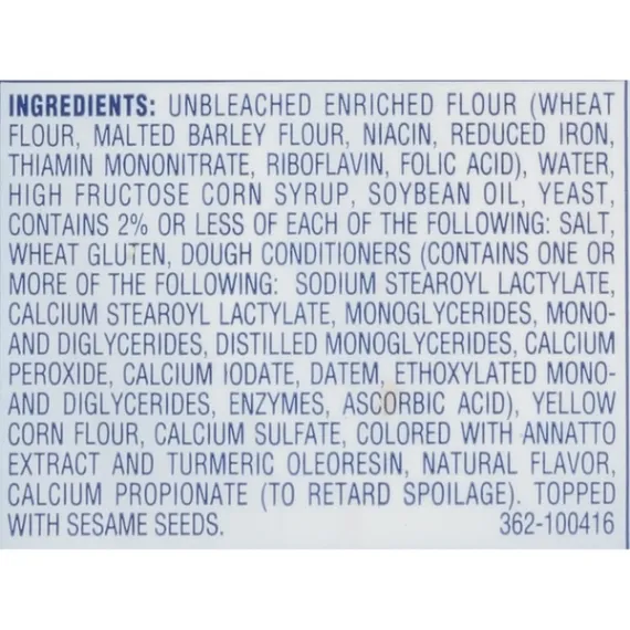 Details Ingredients Unbleached Enriched Flour (Wheat Flour, Malted Barley Flour, Niacin, Reduced Iron, Thiamin Mononitrate, Riboflavin, Folic Acid), Water, High Fructose Corn Syrup, Soybean Oil, Yeast, Contains 2% or Less of Each of the Following: Salt, Wheat Gluten, Dough Conditioners (Contains One or More of the Following: Sodium Stearoyl Lactylate, Calcium Stearoyl Lactylate, Monoglycerides, Mono- and Diglycerides, Distilled Monoglycerides, Calcium Peroxide, Calcium Iodate, DATEM, Ethoxylated Mono- and Diglycerides, Enzymes, Ascorbic Acid), Yellow Corn Flour, Calcium Sulfate, Colored with Annatto Extract and Turmeric Oleoresin, Natural Flavor, Calcium Propionate (to Retard Spoilage). Topped with Sesame Seeds. Show more Product features CBC Quality Pledge Great sandwiches deserve great bread. Sure we know great bread – it's our middle name, after all – and we've been perfecting the art of making bread since we opened our very first bakery. We are a passionate group of food enthusiasts who adore sandwiches and only make the kind of bread we'd proudly serve our friends and family. Our products, as always, are crafted with care, better when shared. That's just the CBC way. 8 Count Net Quantity of Content 8.0 X 1 Roll (53g/1.9 Oz.)