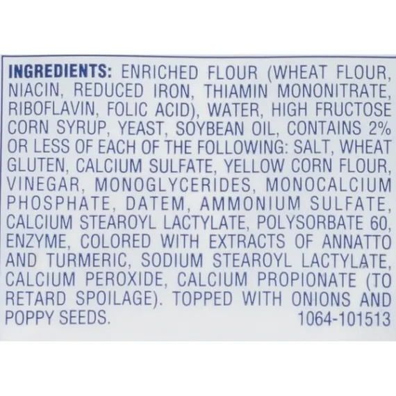Details Ingredients Enriched Flour (Wheat Flour, Niacin, Reduced Iron, Thiamin Mononitrate, Riboflavin, Folic Acid), Water, High Fructose Corn Syrup, Yeast, Soybean Oil, Contains 2% or Less of Each of the Following: Salt, Wheat Gluten, Calcium Sulfate, Yellow Corn Flour, Vinegar, Monoglycerides, Monocalcium Phosphate, DATEM, Ammonium Sulfate, Calcium Stearoyl Lactylate, Polysorbate 60, Enzyme Colored with Extracts of Annatto and Turmeric, Sodium Stearoyl Lactylate, Calcium Peroxide, Calcium Propionate (to Retard Spoilage). Topped with Onions and Poppy Seeds. Show more Product features CBC Quality Pledge Great sandwiches deserve great bread. Sure we know great bread – it's our middle name, after all – and we've been perfecting the art of making bread since we opened our very first bakery. We are a passionate group of food enthusiasts who adore sandwiches and only make the kind of bread we'd proudly serve our friends and family. Our products, as always, are crafted with care, better when shared. That's just the CBC way. 8 Count Net Quantity of Content 8.0 X 1 Roll (53g/1.9 Oz.)