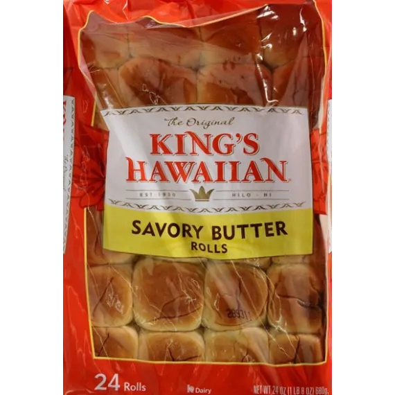 Details Ingredients ENRICHED FLOUR (WHEAT FLOUR, MALTED BARLEY FLOUR, NIACIN, REDUCED IRON, THIAMINE MONONITRATE, RIBOFLAVIN, FOLIC ACID), WATER, SUGAR, BUTTER (PASTEURIZED CREAM, SALT), NONFAT MILK, CONTAINS LESS THAN 2% OF EACH OF THE FOLLOWING: POTATO FLOUR, EGGS, YEAST, DATEM, SALT, WHEY, WHEAT GLUTEN, DEGERMINATED YELLOW CORN FLOUR, SODIUM STEAROYL LACTYLATE, SORBIC ACID PRESERVATIVE, MONOCALCIUM PHOSPHATE, WHEAT FLOUR, CALCIUM SULFATE, ASCORBIC ACID ADDED AS A DOUGH CONDITIONER, WHEAT STARCH, SODIUM SILICOALUMINATE, AMMONIUM SULFATE, ENZYMES, SORBITAN MONOSTEARATE, MONO-& DIGLYCERIDES, CALCIUM SILICATE, MICROCRYSTALLINE CELLULOSE. Show more Product features Rolls, Savory Butter, Bag 24 CT Est. 1950. Per 1 Roll Serving: 100 calories; 1.5 g sat fat (8% DV); 125 mg sodium (5% DV); 4 g sugars. Our Story: In the 1950s in Hilo, Hawaii, a young man named Robert R. Taria had a passion for baking. Working with the finest ingredients, he created bread that was soft, sweet and irresistible. Today, three generations of the Taira family continue the legacy and the aloha spirit, using wholesome ingredients like real butter. Our rolls are wonderful warm from the oven or straight from the bag. Make them into sliders or bite-sized sandwiches. A pack of 24 delicious King's Hawaiian rolls means plenty to go around. Mahalo, from our ohana (family) to yours, The Taira family. Made with real butter. Try our other irresistible products! Jalapeno, honey wheat and original Hawaiian sweet rolls: Irresistible flavors sure to please any crowd! Hot dog buns and hamburger buns: Make any grilling occasion special! For delicious recipe ideas, visit us online at: www.kingshawaiian.com. Consumer Care: (877) My-khcares. (877) 695-4227. Recyclable package. Find us on Facebook and Twitter. Product of USA. Convenient tray for heating. Important: Remove rolls from bag. Leave in oven-safe tray. Place on middle oven rack at 300 degrees F (preheated). For a softer crust, warm in oven for 2-3 minutes. For a crisper crust, warm in oven for 4-5 minutes. Contains: wheat, milk, eggs, soy. 24 rolls [24 oz (1 lb 8 oz) 680 g] 19161 Harborgate Way Torrance, CA 90501 877-MY-KHCARES 2016 King's Hawaiian Holding Co., Inc. Rolls, Savory Butter, Party Pack Per 1 Roll Serving: 90 calories; 1.5 sat fat (8% DV); 115 mg sodium (4% DV); 4 g sugars. No high fructose corn syrup. No artificial dyes. No trans fats. Est. 1950. Hilo, Hawaii. Our Story: Back in the 1950s in Hilo, Hawaii, a man named Robert R. Taira had a passion for baking. He worked tirelessly to create a bread that was soft, sweet and irresistible. After years of making his bread in Hawaii, Robert decided to expand to mainland. Today, the Taira family continues his legacy of creating irresistible products made with Aloha Spirit and enjoyed by millions. Mahalo, The Taira Family. Bring the party to life! Facebook. Pinterest. SmartLabel. Recyclable packages. Product of USA Net Quantity of Content 24 X 28 g