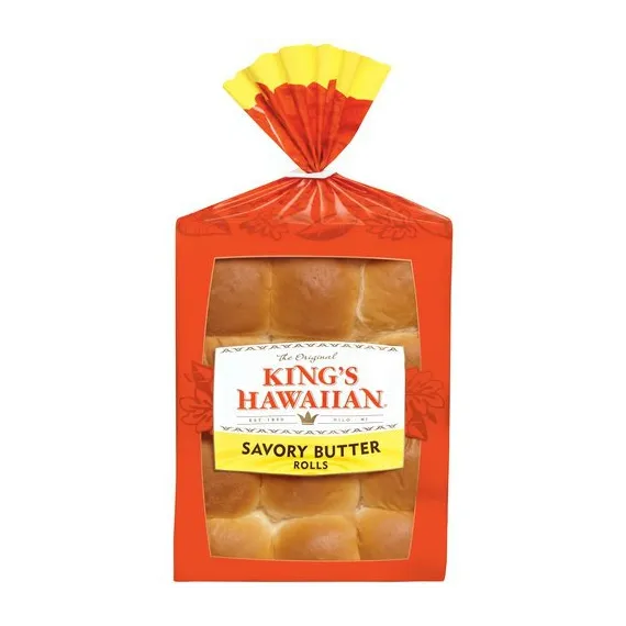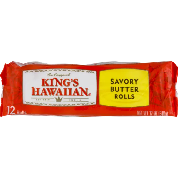 Details Ingredients ENRICHED FLOUR (WHEAT FLOUR, MALTED BARLEY FLOUR, NIACIN, REDUCED IRON, THIAMINE MONONITRATE, RIBOFLAVIN, FOLIC ACID), WATER, SUGAR, BUTTER (PASTEURIZED CREAM, SALT), NONFAT MILK, CONTAINS LESS THAN 2% OF EACH OF THE FOLLOWING: POTATO FLOUR, EGGS, YEAST, DATEM, SALT, WHEY, WHEAT GLUTEN, DEGERMINATED YELLOW CORN FLOUR, SODIUM STEAROYL LACTYLATE, SORBIC ACID PRESERVATIVE, MONOCALCIUM PHOSPHATE, WHEAT FLOUR, CALCIUM SULFATE, ASCORBIC ACID ADDED AS A DOUGH CONDITIONER, WHEAT STARCH, SODIUM SILICOALUMINATE, AMMONIUM SULFATE, ENZYMES, SORBITAN MONOSTEARATE, MONO-& DIGLYCERIDES, CALCIUM SILICATE, MICROCRYSTALLINE CELLULOSE. Show more Product features Rolls, Savory Butter, Bag 12 CT The original King's Hawaiian. Est. 1950. Hilo HI. Established 1950. Made with real butter. Our Story: Back in the 1950s in Hilo, Hawaii, a young man named Robert Taira had a passion for baking. Working with the finest ingredients, he refined his recipe until he created a bread that was soft, sweet and irresistible. Today, three generations of the Taira family continue the legacy and the aloha spirit, using wholesome ingredients like real butter. Our rolls are wonderful warm from the oven or straight from the bag. Try them with sliders or to make bite sized sandwiches. A pack of 12 delicious rolls means some for you and some to share. Mahalo, from our ohana (family) to yours, - the Taira family. Try our other irresistible flavors. King's Hawaiian flavors complement any meal! Wholesome ingredients make all our products irresisible! Convenient tray for heating. For delicious recipe ideas, visit us online at: www.kingshawaiian.com. Consumer Care: (877)My-KHcares (877)695-4227. Recyclable package. Find us on Facebook and Twitter. Product of USA. Important: Remove rolls from bag. Leave in the oven-safe tray. Place on middle oven rack at 300 degrees F (preheated). For a softer crust, warm in oven for 2-3 minutes. For a crisper crust, warm in oven for 4-5 minutes. Contains: wheat, milk, eggs, soy. 12 rolls [12 oz (340 g)] 19161 Harborgate Way Torrance, CA 90501 877-MY-KHCARES Rolls, Savory Butter Made with real butter. Per 1 Roll Serving: 90 calories; 1.5 g sat fat (7% DV); 115 mg sodium (5% DV); 5 g sugars. No high fructose corn syrup. No artificial dyes. No trans fats. Est. 1950. Our story back in the 1950s in Hilo, Hawaii, a man named Robert R. Taira had a passion for baking. He worked tirelessly to create a bread that was soft, sweet and irresistible. After years of making his bread in Hawaii, Robert decided to expand to the mainland. Today, the Taira family continues his legacy of creating irresistible products made with Aloha Spirit and enjoyed by millions. - Mahalo, The Taira Family. Try something new! Use our rolls to make sliders, shutting or even pizza crust! For additional inspiration and so to learn about our other products (like hot dog buns and mini sub rolls), goto kingshawaiian.com/recipes or check us out on Facebook and Pinterest. Visit us online at: www.kingshawaiian.com. Consumer Care: (877) My-Khcares (877) 695-4227. SmartLabel: Scan for more information. Recyclable package. Hilo, Hawaii. Product of USA. Special Features Made with real butter Net Quantity of Content 12 X 28 g