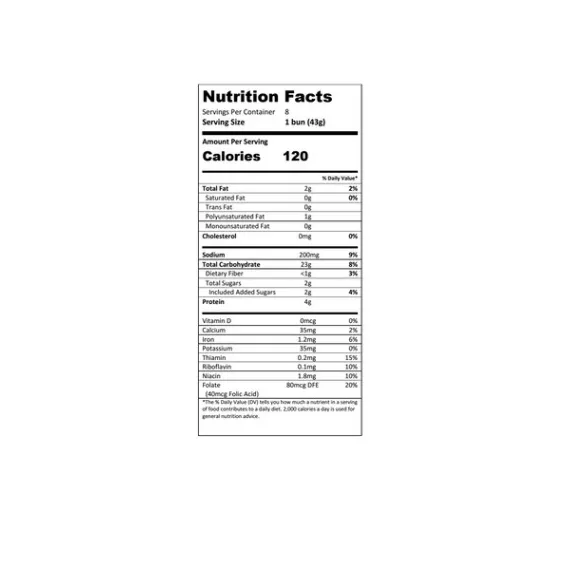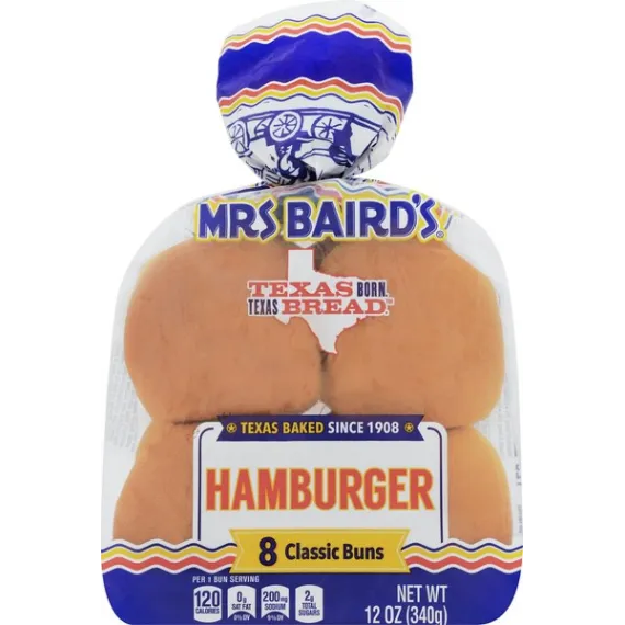 Details Ingredients Enriched Wheat Flour [Flour, Malted Barley Flour, Reduced Iron, Niacin, Thiamin Mononitrate (Vitamin B1), Riboflavin (Vitamin B2), Folic Acid], Water, Sugar, Yeast, Soybean Oil, Wheat Gluten, Salt, Monoglycerides, Calcium Propionate (Preservative), Datem, Grain Vinegar, Citric Acid, Calcium Sulfate, Potassium Iodate, Monocalcium Phosphate, Soy Lecithin. Show more Product features Texas Baked Since 1908. Backyard barbeques. Tailgates. Mrs Baird's buns. They're what Texas traditions are made of. Since 1908, Mrs Baird's bread has stood for quality and softness, and our buns let you continue the tradition Ninnie Baird started whenever and wherever you serve hamburgers or hot dogs. It's not just a family tradition it's a Texas tradition. 120 calories per 1 bun serving. 0g saturated fat (0% Daily Value) per serving. No high fructose corn syrup. Calcium 35mg (2% Daily Value) per serving. Iron 1.2mg (6% Daily Value) per serving. Net Quantity of Content 8.0 X 1 bun