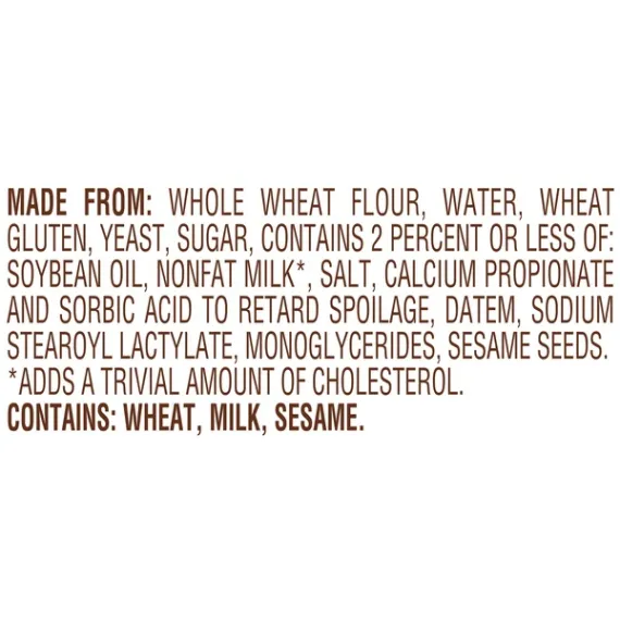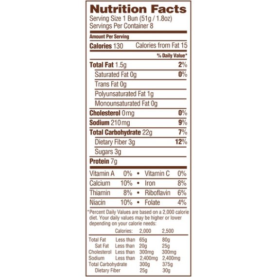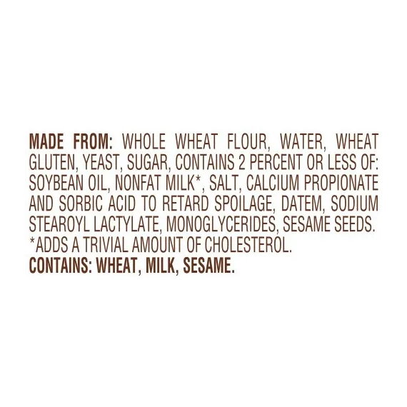 Details Ingredients Made From: Whole Wheat Flour, Water, Wheat Gluten, Yeast, Sugar, Contains 2 Percent Or Less Of: Soybean Oil, Nonfat Milk*, Salt, Calcium Propionate And Sorbic Acid To Retard Spoilage, Datem, Sodium Stearoyl Lactylate, Monoglycerides, Sesame Seeds. *Adds A Trivial Amount Of Cholesterol. Contains: Wheat, Milk, Sesame. Show more Product features Timeless and without pretense, our "Bakery Classics" stand for quality, with premium ingredients, perfectly orchestrated with a baker's touch. Make your barbecues a little more special with our delicious buns. 100% Whole Wheat Hamburger Buns No artificial color or flavors Low fat, cholesterol free, and 0g trans fat per serving 14.5 oz., 8 count bag Special Features Soft Net Quantity of Content 8.0 X 1 Bun (51g/1.8 oz)