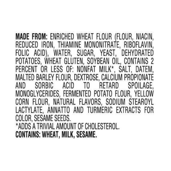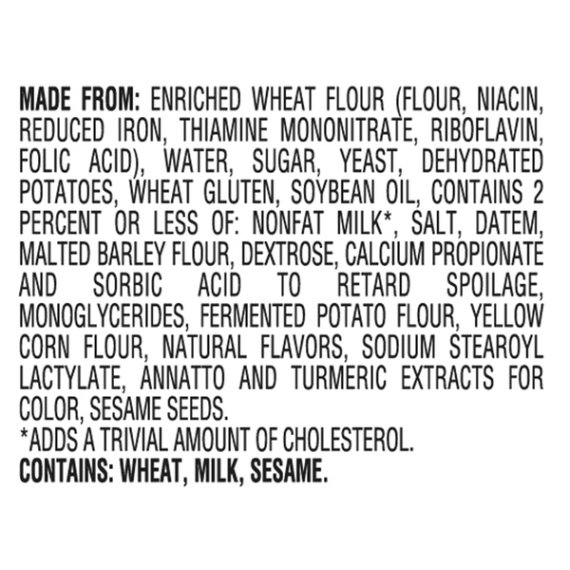 Details Ingredients Made From: Enriched Wheat Flour (Flour, Niacin, Reduced Iron, Thiamine Mononitrate, Riboflavin, Folic Acid), Water, Sugar, Yeast, Dehydrated Potatoes, Wheat Gluten, Soybean Oil, Contains 2 Percent Or Less Of: Nonfat Milk*, Salt, Datem, Malted Barley Flour, Dextrose, Calcium Propionate And Sorbic Acid To Retard Spoilage, Monoglycerides, Fermented Potato Flour, Yellow Corn Flour, Natural Flavors, Sodium Stearoyl Lactylate, Annatto And Turmeric Extracts For Color, Sesame Seeds. *Adds A Trivial Amount Of Cholesterol. Contains: Wheat, Milk, Sesame. Show more Product features Timeless and without pretense, our "Bakery Classics" stand for quality, with premium ingredients, perfectly orchestrated with a baker's touch. Make your barbecues a little more special with our delicious buns. Golden Potato Slider Buns No artificial flavors 0g trans fat per serving Cholesterol free 15 oz., 12 count bag Net Quantity of Content 12.0 X 1 bun (36g/1.3 oz.)