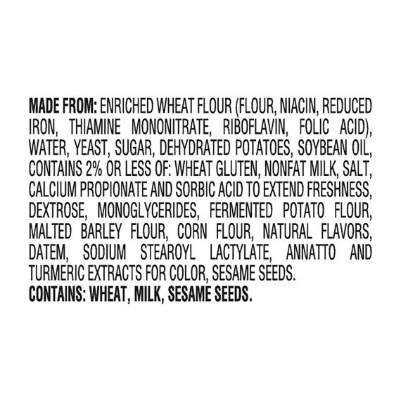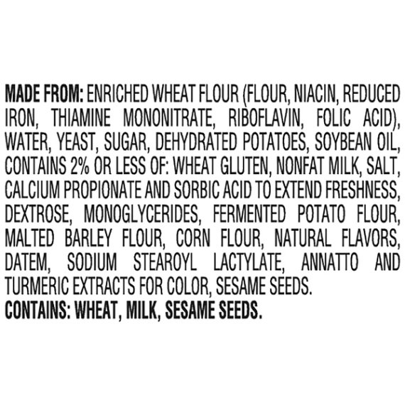 Details Ingredients Made From: Enriched Wheat Flour (Flour, Niacin, Reduced Iron, Thiamine Mononitrate, Riboflavin, Folic Acid), Water, Yeast, Sugar, Dehydrated Potatoes, Soybean Oil, Contains 2% Or Less Of: Wheat Gluten, Nonfat Milk, Salt, Calcium Propionate And Sorbic Acid To Extend Freshness, Dextrose, Monoglycerides, Fermented Potato Flour, Malted Barley Flour, Corn Flour, Natural Flavors, Datem, Sodium Stearoyl Lactylate, Annatto And Turmeric Extracts For Color, Sesame Seeds. Contains: Wheat, Milk, Sesame Seeds. Show more Product features Timeless and without pretense, our "Bakery Classics" stand for quality, with premium ingredients, perfectly orchestrated with a baker's touch. With no artificial flavors, 0g trans fat and cholesterol free, we hope you agree that our bakers have created a delicious premium quality bun. Make your barbecues a little more special with our delicious buns. Golden Potato Top-Sliced Hot Dog Buns crafted with premium ingredients 8 split-top hot dog buns per bag No artificial flavors Cholesterol free, and 0g trans fat per serving Net Quantity of Content 8.0 X 1 Bun (50g)