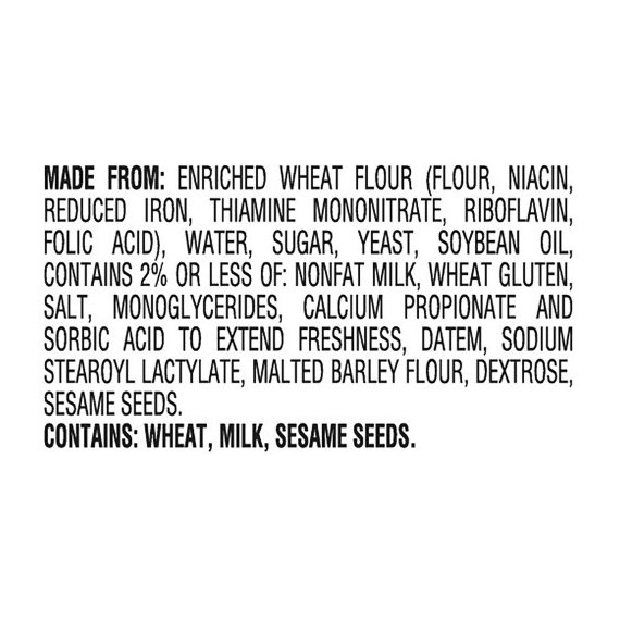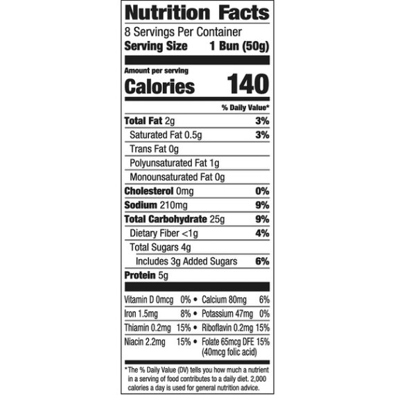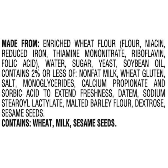 Details Ingredients Made From: Enriched Wheat Flour (Flour, Niacin, Reduced Iron, Thiamine Mononitrate, Riboflavin, Folic Acid), Water, Sugar, Yeast, Soybean Oil, Contains 2% Or Less Of: Nonfat Milk, Wheat Gluten, Salt, Monoglycerides, Calcium Propionate And Sorbic Acid To Extend Freshness, Datem, Sodium Stearoyl Lactylate, Malted Barley Flour, Dextrose, Sesame Seeds. Contains: Wheat, Milk, Sesame Seeds. Show more Product features Timeless and without pretense, our "Bakery Classics" buns stand for quality, with premium ingredients, perfectly orchestrated with a baker's touch. Make your barbecues a little more special with our delicious buns. Top Sliced Hot Dog Buns No artificial color or flavors Cholesterol free, and 0g trans fat per serving 14 oz., 8 count bag Baked with quality ingredients Net Quantity of Content 8.0 X 1 Bun (50g)