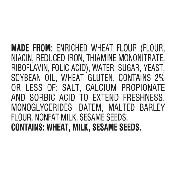 Details Ingredients Made From: Enriched Wheat Flour (Flour, Niacin, Reduced Iron, Thiamine Mononitrate, Riboflavin, Folic Acid), Water, Sugar, Yeast, Soybean Oil, Wheat Gluten, Contains 2% Or Less Of: Salt, Calcium Propionate And Sorbic Acid To Extend Freshness, Monoglycerides, Datem, Malted Barley Flour, Nonfat Milk*, Sesame Seeds. *Adds A Trivial Amount Of Cholesterol. Contains: Wheat, Milk, Sesame Seeds. Show more Product features Timeless and without pretense, our "Bakery Classics" stand for quality, with premium ingredients, perfectly orchestrated with a baker's touch. Make your barbecues a little more special with our delicious buns. Slider White Buns No artificial colors or flavors 0g trans fat per serving Cholesterol free 15 oz., 12 count bag Net Quantity of Content 12.0 X 1 Bun (36g)
