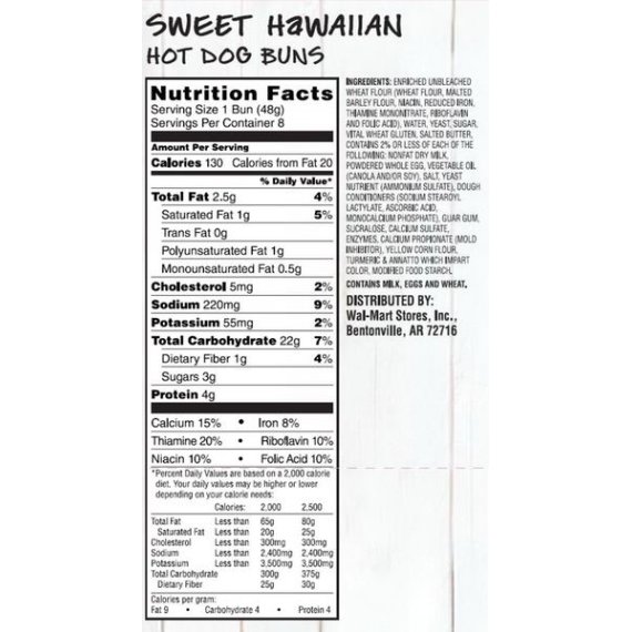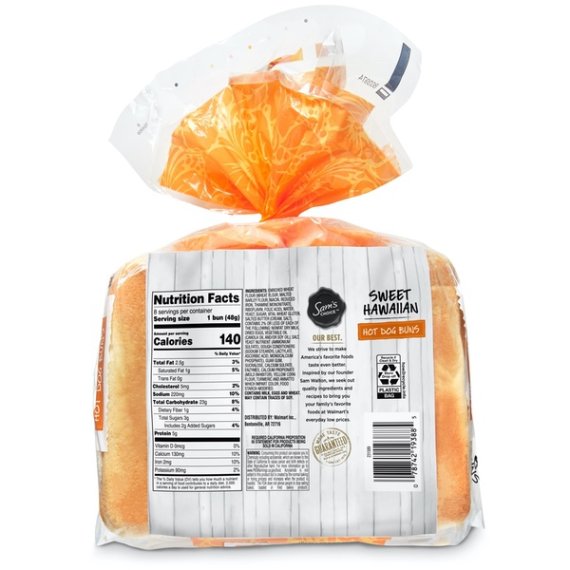 Details Ingredients ENRICHED UNBLEACHED WHEAT FLOUR (WHEAT FLOUR, MALTED BARLEY FLOUR, NIACIN, REDUCED IRON, THIAMINE MONONITRATE, RIBOFLAVIN AND FOLIC ACID), WATER, YEAST, SUGAR, VITAL WHEAT GLUTEN, SALTED BUTTER, CONTAINS 2% OR LESS OF EACH OF THE FOLLOWING: NONFAT DRY MILK, POWDERED WHOLE EGG, VEGETABLE OIL (CANOLA AND/OR SOY), SALT, YEAST NUTRIENT (AMMONIUM SULFATE), DOUGH CONDITIONERS (SODIUM STEAROYL LACTYLATE, ASCORBIC ACID, MONOCALCIUM PHOSPHATE), GUAR GUM, SUCRALOSE, CALCIUM SULFATE, ENZYMES, CALCIUM PROPIONATE (MOLD INHIBITOR), YELLOW CORN FLOUR, TURMERIC & ANNATTO WHICH IMPART COLOR, MODIFIED FOOD STARCH. Show more Product features Sam's Choice Sweet Hawaiian Hot Dog Buns are made with enriched unbleached wheat flour that provide soft, fluffy-textured buns with just a hint of sweetness. Whether you like chili, mustard or simple ketchup on your hotdog, these buns are perfect to hold all the sauces and toppings you want. These buns are made with high quality ingredients to provide a texture that helps hold all the flavors together in every bite. The package contains eight buns, so there’s plenty for the whole family to enjoy. Perfect for sausages, bratwurst, hot dogs, and more, bring home Sam's Choice Sweet Hawaiian Hot Dog Buns for dinner tonight. Named after our iconic founder, Walmart's Sam's Choice brand provides families with premium, high-quality food and grocery options with the best value. With our wide range of products spanning grocery, packaged food, pre-packaged deli, dairy and frozen food, we offer you a tailored assortment that is both innovative and enticing. Our authentic products are inspired by our proud heritage and are trusted today by the millions of customers using them across the nation. Sam's Choice Hawaiian Hot Dog Buns, 13.5 oz, 8 Count: Light, fluffy hot dog buns Made with enriched dough 8 servings per bag 130 calories per serving Net Quantity of Content 8 X 1 Bun (48 g)
