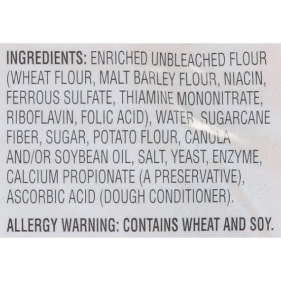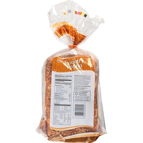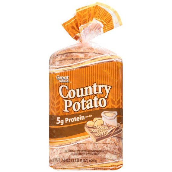 Details Ingredients ENRICHED UNBLEACHED WHEAT FLOUR (WHEAT FLOUR, MALTED BARLEY FLOUR, NIACIN, REDUCED IRON, THIAMINE MONONITRATE, RIBOFLAVIN, FOLIC ACID), WATER, SUGAR, YEAST, POTATO FLOUR, VEGETABLE OIL (CANOLA AND/OR SOY OIL), BUTTERMILK POWDER, CONTAINS 2% OR LESS OF EACH OF THE FOLLOWING: SALT, DOUGH CONDITIONERS (MONO- AND DIGLYCERIDES, ASCORBIC ACID), CALCIUM PROPIONATE (MOLD INHIBITOR), VITAL WHEAT GLUTEN, DISTILLED VINEGAR, YELLOW CORN FLOUR, TURMERIC (COLOR), ANNATTO EXTRACT (COLOR), CALCIUM SULFATE, ENZYMES, NONFAT DRY MILK, SOY FLOUR. Show more Product features Great Value Country Potato Bread has a fresh from the bakery taste. The soft texture is perfect for sandwiches, burgers and toast. Use it to make hand crafted sandwiches filled with all your favorite meats, cheese and veggies, or toast and serve with scrambled eggs, crispy bacon and pancakes for a filling breakfast. With its rustic flavor and soft, fresh from the bakery texture, Great Value Country Potato Bread lends itself to inclusion with any meal. It also offers nutritional benefits as it a good source of folic acid and niacin. Enjoy tasty sandwiches with the addition of Great Value Country Potato Bread. Great Value products provide families with affordable, high quality grocery and household consumable options. With our wide range of product categories spanning grocery and household consumables, we offer you a variety of products for your family's needs. Our products are conveniently available online and in Walmart stores nationwide, allowing you to stock up and save money at the same time. Great Value Country Potato Bread, 24oz: Great for sandwiches Pre-sliced 0 grams of trans fat Net weight 24 oz Net Quantity of Content 17 X 40 g