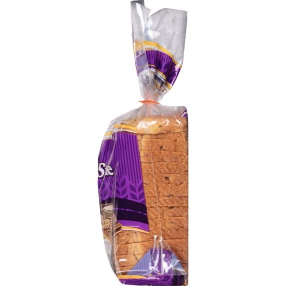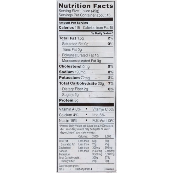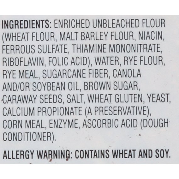 Details Ingredients ENRICHED UNBLEACHED WHEAT FLOUR (WHEAT FLOUR, MALTED BARLEY FLOUR, NIACIN, REDUCED IRON, THIAMINE MONONITRATE, RIBOFLAVIN, FOLIC ACID), WATER, RYE FLOUR, RYE MEAL, YEAST, CONTAINS 2% OR LESS OF EACH OF THE FOLLOWING: MOLASSES, CARAWAY SEEDS, VITAL WHEAT GLUTEN, SALT, VEGETABLE OIL (CANOLA AND/OR SOY OIL), SUGAR, RAISIN JUICE CONCENTRATE, YEAST NUTRIENT (AMMONIUM SULFATE), DOUGH CONDITIONERS (MONO- AND DIGLYCERIDES, SODIUM STEAROYL LACTYLATE, ASCORBIC ACID), CALCIUM PROPIONATE (MOLD INHIBITOR), CALCIUM SULFATE, ENZYMES, NONFAT DRY MILK, SOY FLOUR. Show more Product features Bread is a low-fat, cholesterol-free food. Great Value New York Style Rye Bread, 24oz: 5g protein per slice No high fructose corn syrup No cholesterol 0g trans fat per serving 24oz net weight Net Quantity of Content 17 X 40 g