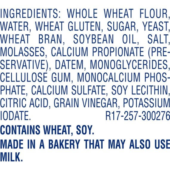 Details Ingredients Whole Wheat Flour, Water, Wheat Gluten, Sugar, Yeast, Wheat Bran, Soybean Oil, Salt, Molasses, Calcium Propionate (Preservative), Datem, Monoglycerides, Cellulose Gum, Monocalcium Phosphate, Calcium Sulfate, Soy Lecithin, Citric Acid, Grain Vinegar, Potassium Iodate. Show more Product features Texas Baked Since 1908. For years Mrs Baird's Bread has been a local favorite. When Ninnie Baird began baking bread in 1908, she used quality ingredients and a slow baking process the result was bread so soft and delicious it won the heart of Texas. Over 100 years later, Mrs Baird's original values are still upheld, and her breads are just as delicious. Try other Mrs Baird's favorites, like Honey 7 Grain and made with Whole Grain White! Mrs Baird's: Texas Born. Texas Bread..® 13g whole grain per serving. No high fructose corn syrup. No artificial flavors or colors. 0g saturated fat (0% Daily Value) per serving. 60 calories per 1 slice serving. Special Features 15G whole grains per serving Net Quantity of Content 22.0 X 1 slice