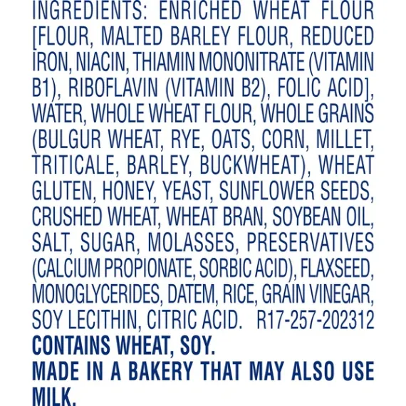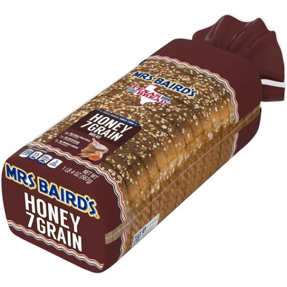 Details Ingredients Enriched Wheat Flour [Flour, Malted Barley Flour, Reduced Iron, Niacin, Thiamin Mononitrate (Vitamin B1), Riboflavin (Vitamin B2), Folic Acid], Water, Whole Wheat Flour, Whole Grains (Bulgur Wheat, Rye, Oats, Corn, Millet, Triticale, Barley, Buckwheat), Wheat Gluten, Honey, Yeast, Sunflower Seeds, Crushed Wheat, Wheat Bran, Soybean Oil, Salt, Sugar, Molasses, Preservatives (Calcium Propionate, Sorbic Acid), Flaxseed, Monoglycerides, Datem, Rice, Grain Vinegar, Soy Lecithin, Citric Acid. Show more Product features Texas Baked Since 1908. For years Mrs Baird's Bread has been a local favorite. When Ninnie Baird began baking bread in 1908, she used quality ingredients and a slow baking process the result was bread so soft and delicious it won the heart of Texas. Over 100 years later, Mrs Baird's original values are still upheld, and her breads are just as delicious. Try other Mrs Baird's favorites, like Whole Grain Wheat and 100% Whole Wheat! Mrs Baird's: Texas Born. Texas Bread..® 8g whole grain per serving. No high fructose corn syrup. No artificial flavors or colors. 0.5g saturated fat (3% Daily Value) per serving. 150 calories per 2 slice serving. Special Features Made with whole grain Net Quantity of Content 10.0 X 2 slices