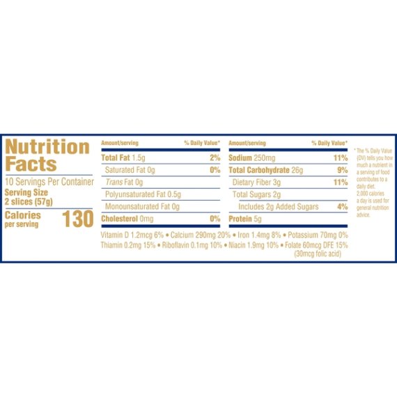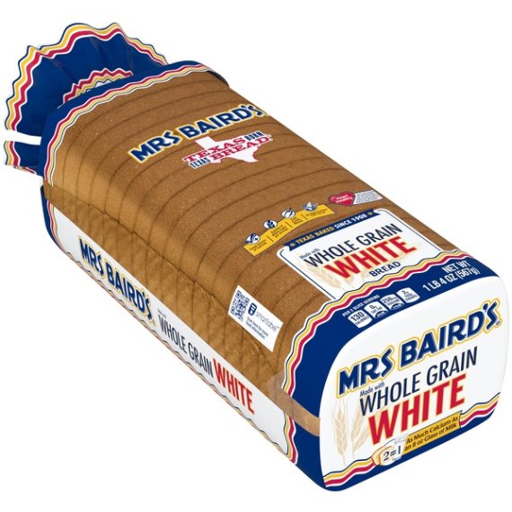 Details Ingredients Enriched Wheat Flour [Flour, Malted Barley Flour, Reduced Iron, Niacin, Thiamin Mononitrate (Vitamin B1), Riboflavin (Vitamin B2), Folic Acid], Water, Whole Wheat Flour, Sugar, Yeast, Wheat Gluten, Cellulose Fiber, Calcium Sulfate, Salt, Soybean Oil, Preservatives (Calcium Propionate, Sorbic Acid), Soy Flour, Monoglycerides, Datem, Citric Acid, Soy Lecithin, Vitamin D3, Potassium Iodate, Grain Vinegar, Monocalcium Phosphate. Show more Product features Texas Baked Since 1908. Since 1908, Mrs Baird's® Bread has stood for quality and softness. Ninnie Baird always said, If you're going to do something, do it right. And we still uphold her values today. We start with fine ingredients, we never rush the baking process, and the result is a bread of legendary softness, smoothness and taste that's enriched with more than 100 years of family tradition. Mrs Baird's: Texas Born. Texas Bread.® Good source of calcium. 9 grams of Whole Grain per serving. No high fructose corn syrup. 0g saturated fat (0% Daily Value) per serving. 130 calories per 2 slice serving. Special Features Made with real milk Net Quantity of Content 10.0 X 2 slices